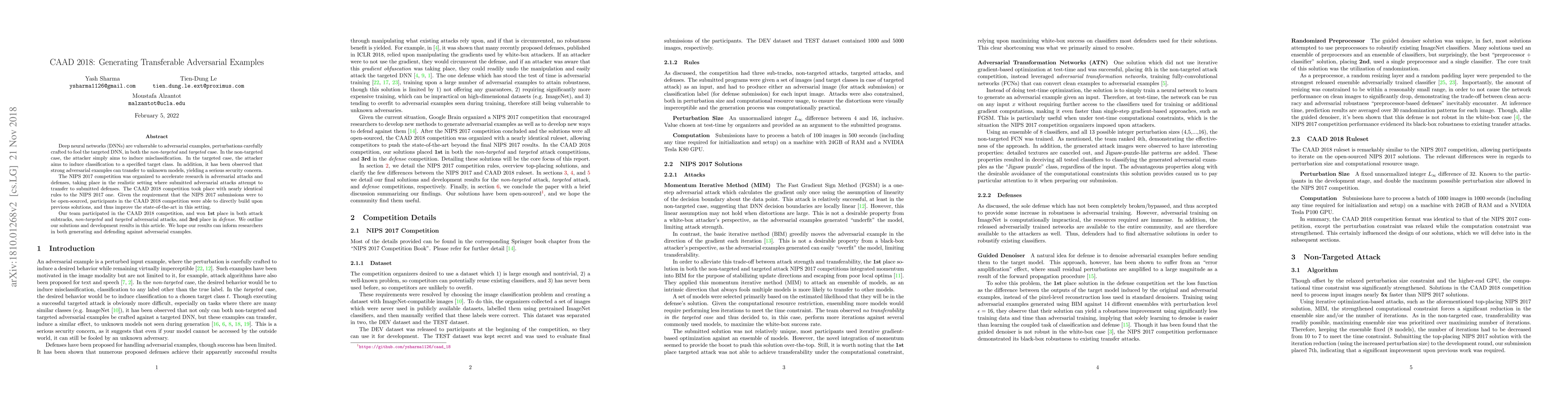 The paper discusses the CAAD 2018 competition focused on generating transferable adversarial examples for deep neural networks, highlighting the vulnerability of DNNs to both targeted and non-targeted attacks. The authors' team won first place in both attack categories and third place in defense, sharing their successful strategies to advance research in adversarial attacks and defenses.