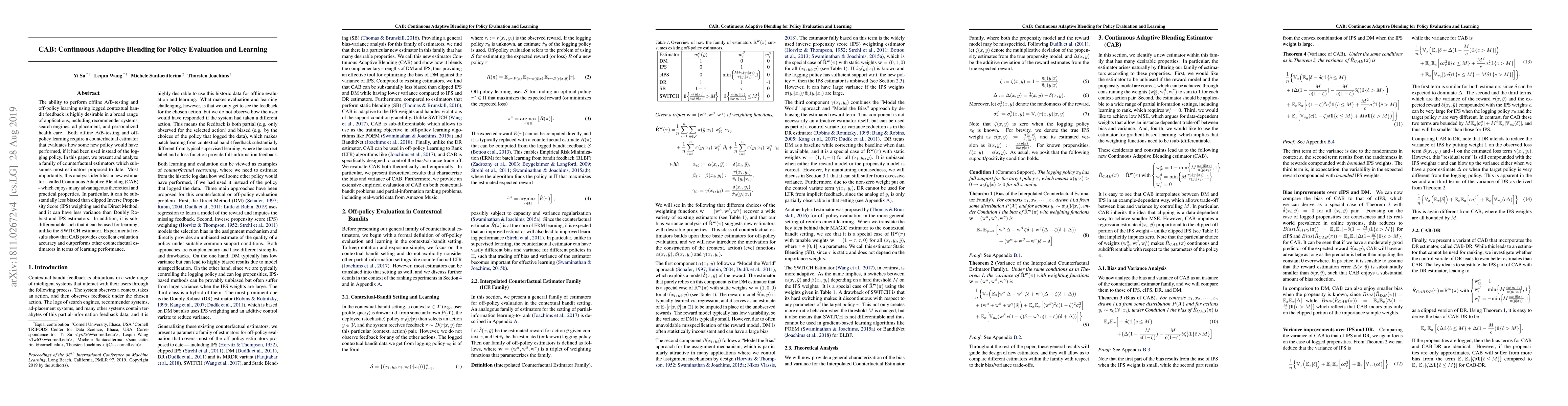 This paper introduces the Continuous Adaptive Blending (CAB) estimator for offline A/B-testing and off-policy learning, demonstrating it to be less biased and more efficient than existing methods like clipped IPS and Direct Method, while also being sub-differentiable for policy learning. Experimental results show CAB's superior evaluation accuracy and learning performance.
