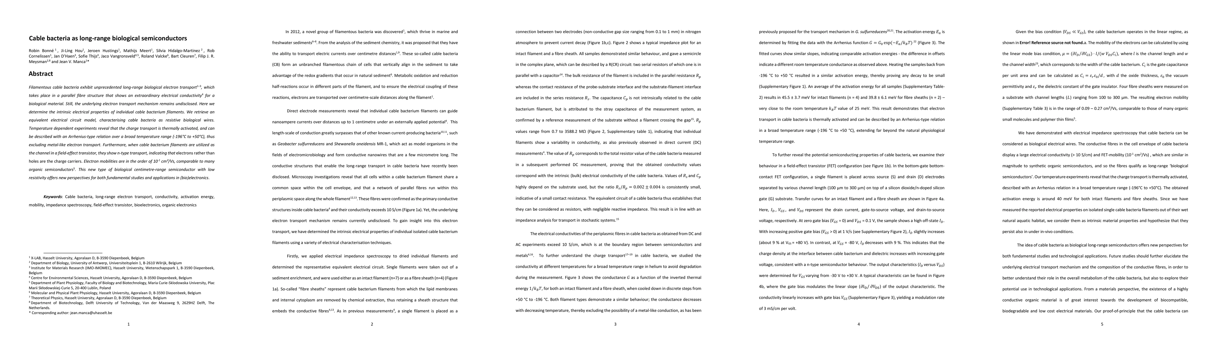 This research identifies cable bacteria as unique, long-range biological semiconductors, demonstrating their resistive properties through circuit modeling. The electron transport is thermally activated and involves electrons as charge carriers, with mobilities comparable to organic semiconductors. This discovery opens new avenues for fundamental research and (bio)electronics applications.
