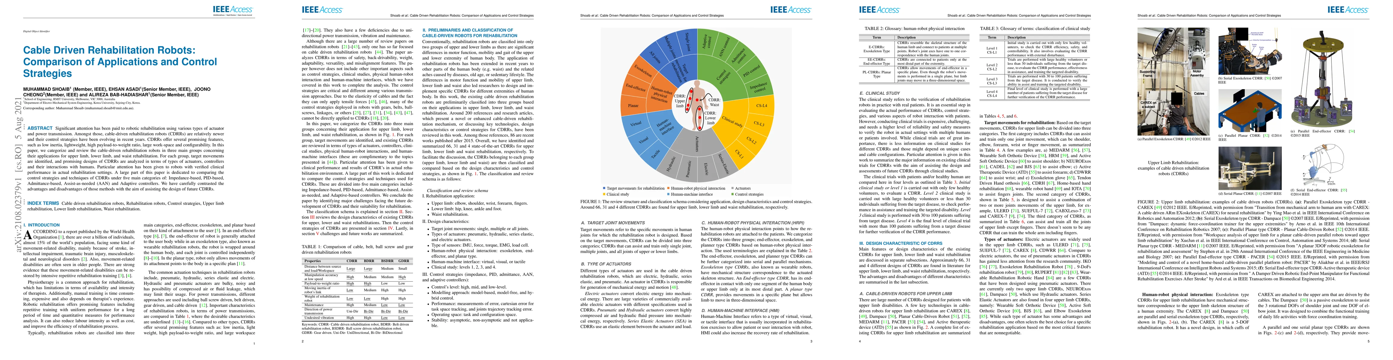 This paper categorizes and reviews cable-driven rehabilitation robots (CDRRs) for upper, lower limb, and waist rehabilitation, analyzing their actuators, controllers, and clinical performance. It also compares control strategies, including impedance-based, PID-based, admittance-based, Assist-as-needed (AAN), and adaptive controllers, to guide future CDRR design.