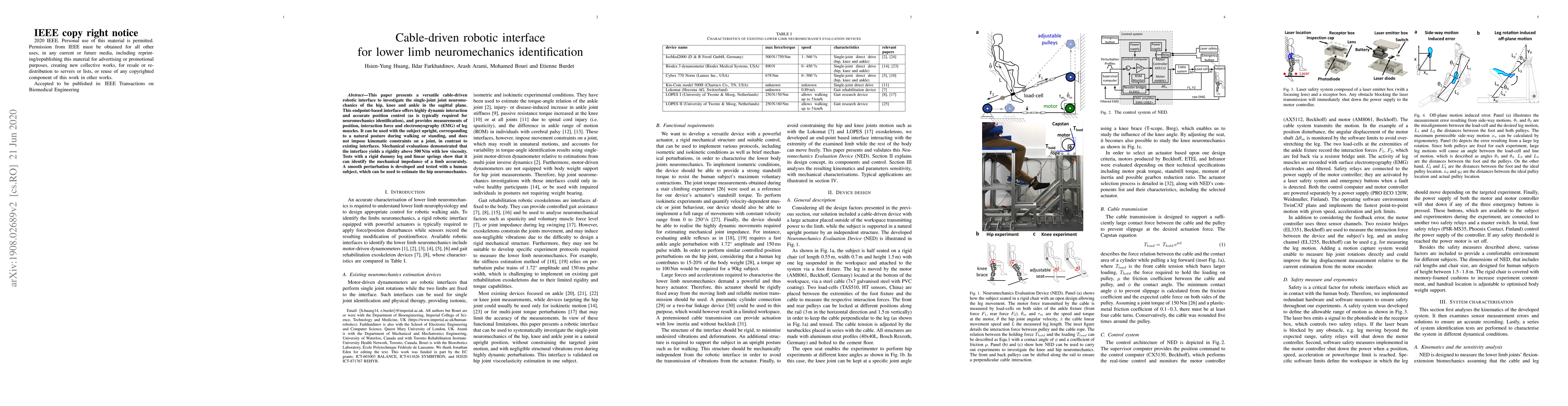 This paper presents a versatile cable-driven robotic interface to investigate the single-joint joint neuromechanics of the hip, knee and ankle. This endpoint-based interface offers highly dynamic interaction and accurate position control, as is typically required for neuromechanics identification. It can be used with the subject upright, corresponding to natural posture during walking or standing, and does not impose kinematic constraints on a joint, in contrast to existing interfaces. Mechanical evaluations demonstrated that the interface yields a rigidity above 500N/m with low viscosity. Tests with a rigid dummy leg and linear springs show that it can identify the mechanical impedance of a limb accurately. A smooth perturbation is developed and tested with a human subject, which can be used to estimate the hip neuromechanics.