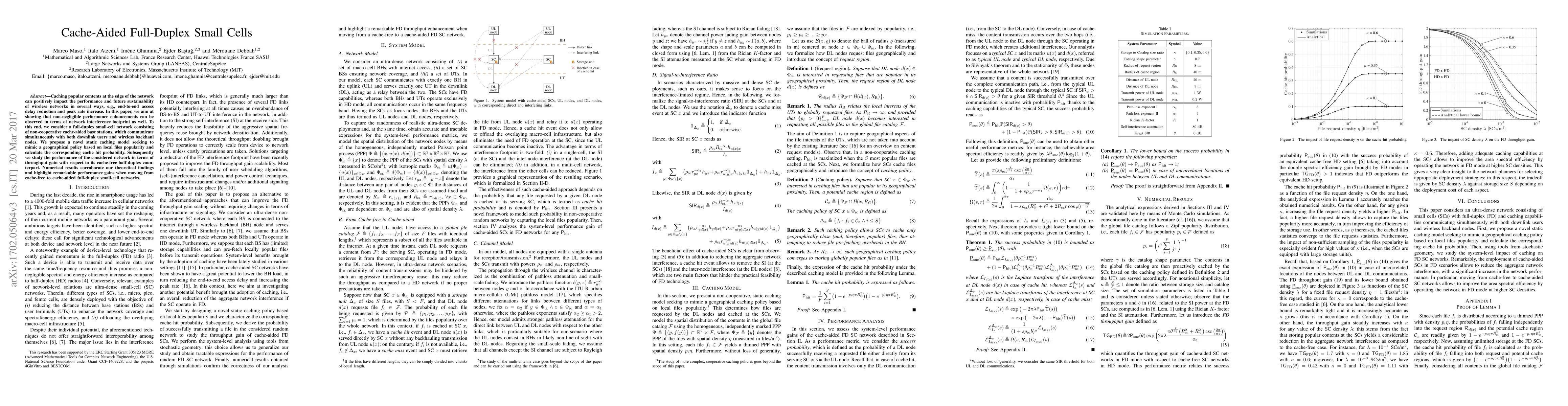 This paper investigates the benefits of caching popular contents at small-cell base stations to enhance performance and sustainability in wireless networks. It proposes a novel caching model for full-duplex small cells, demonstrating significant throughput gains and reduced network interference compared to cache-free half-duplex systems.