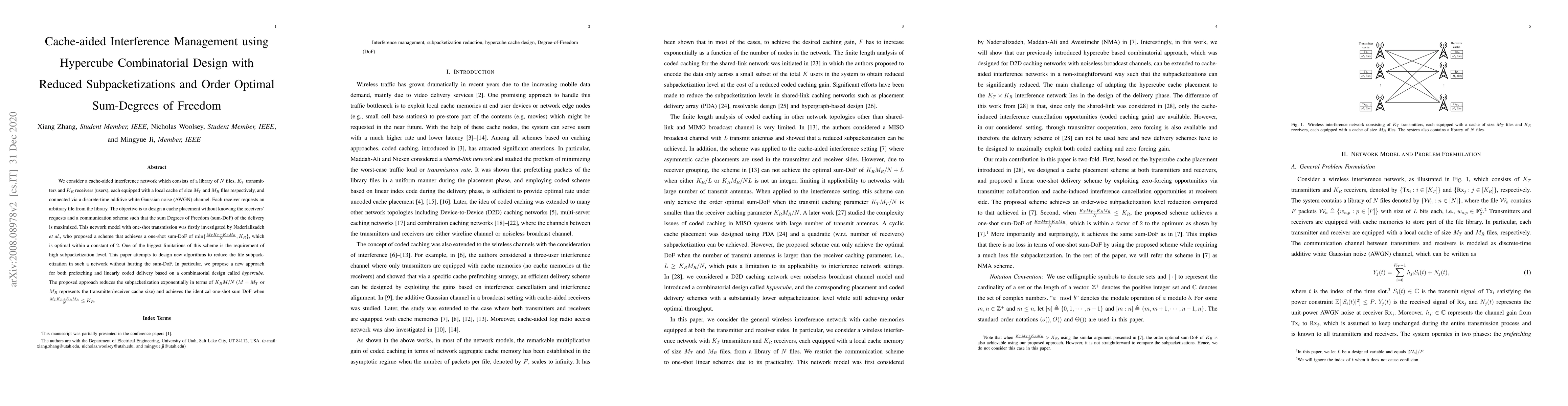This paper proposes a new cache-aided interference management scheme using hypercube combinatorial design to reduce subpacketization levels while maintaining optimal sum Degrees of Freedom (DoF) in a cache-aided network with multiple transmitters and receivers. The approach achieves the same one-shot sum DoF as previous methods but with significantly lower subpacketization.