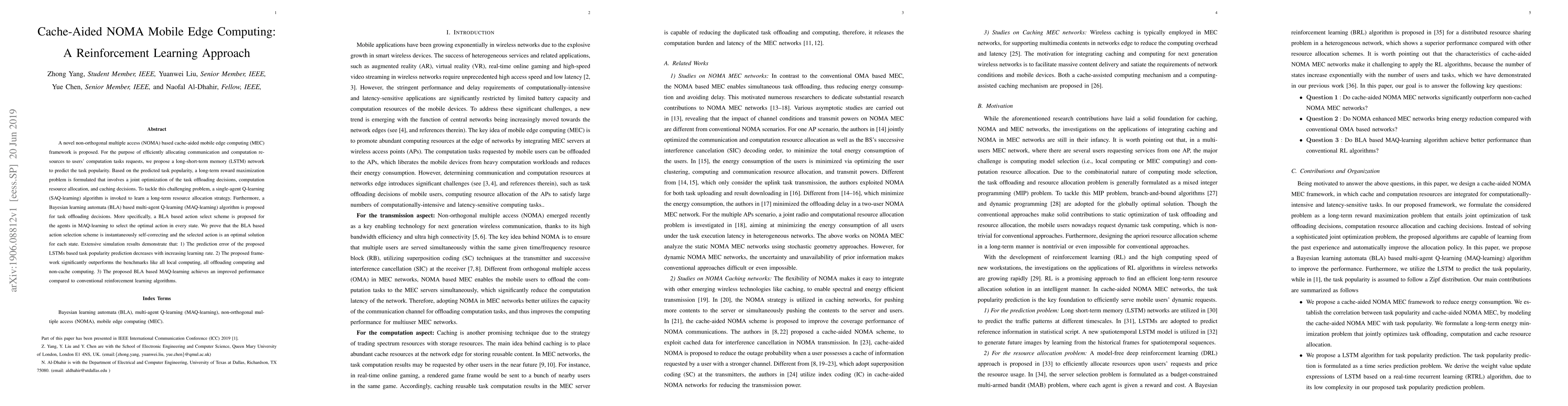 This paper proposes a cache-aided NOMA-based mobile edge computing framework using reinforcement learning for resource allocation. It employs LSTM networks for task popularity prediction and a SAQ-learning algorithm for long-term resource optimization, alongside a BLA-based MAQ-learning for task offloading decisions, achieving superior performance over benchmark methods.