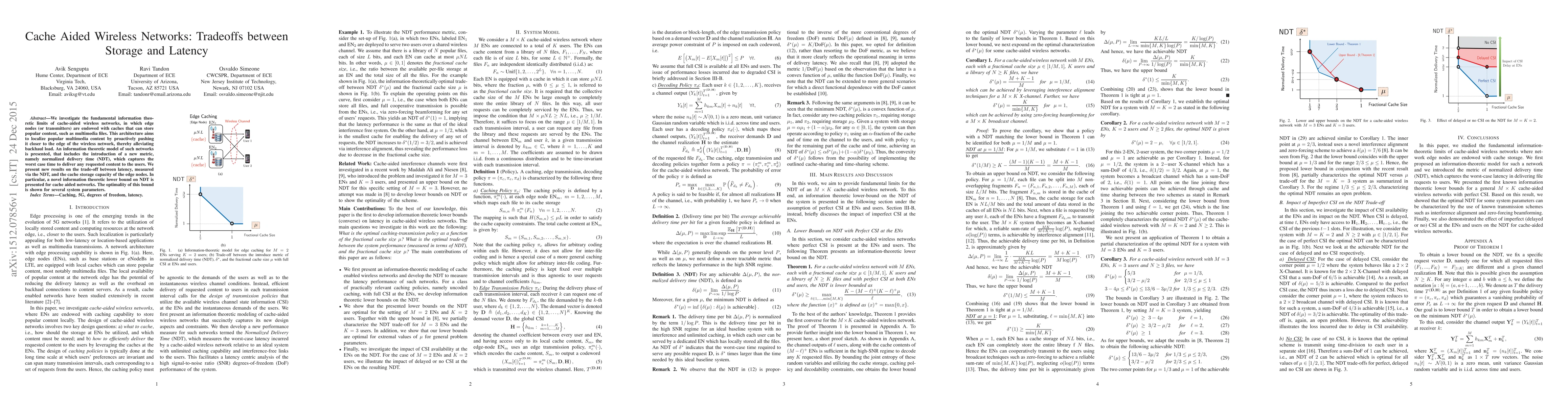 We investigate the fundamental information theoretic limits of cache-aided wireless networks, in which edge nodes (or transmitters) are endowed with caches that can store popular content, such as multimedia files. This architecture aims to localize popular multimedia content by proactively pushing it closer to the edge of the wireless network, thereby alleviating backhaul load. An information theoretic model of such networks is presented, that includes the introduction of a new metric, namely normalized delivery time (NDT), which captures the worst case time to deliver any requested content to the users. We present new results on the trade-off between latency, measured via the NDT, and the cache storage capacity of the edge nodes. In particular, a novel information theoretic lower bound on NDT is presented for cache aided networks. The optimality of this bound is shown for several system parameters.