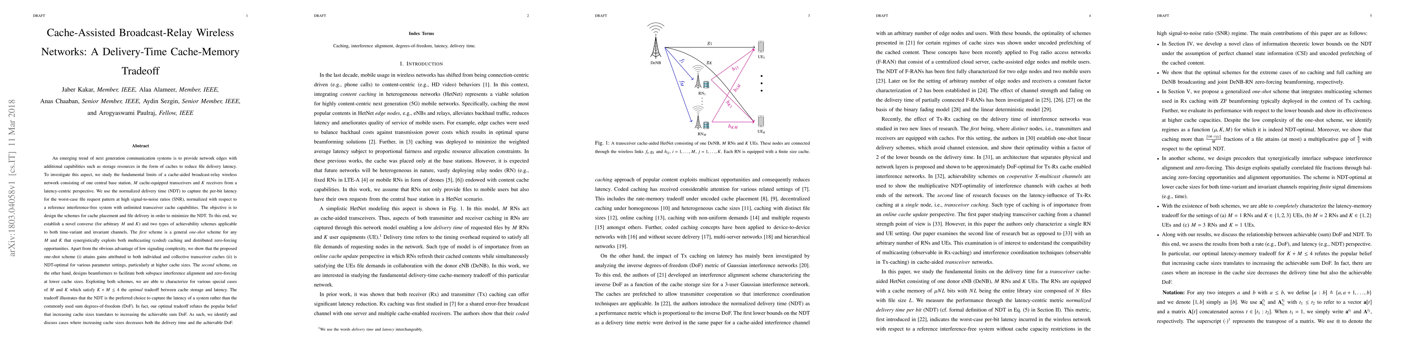 This paper investigates the fundamental limits of cache-aided broadcast-relay wireless networks to minimize normalized delivery time (NDT), focusing on the tradeoff between cache memory and latency. It proposes two schemes: a one-shot scheme that leverages multicasting and distributed zero-forcing, and a beamformer-based scheme for lower cache sizes, demonstrating optimal tradeoffs between cache and latency that challenge the conventional belief about cache size and sum degrees-of-freedom.