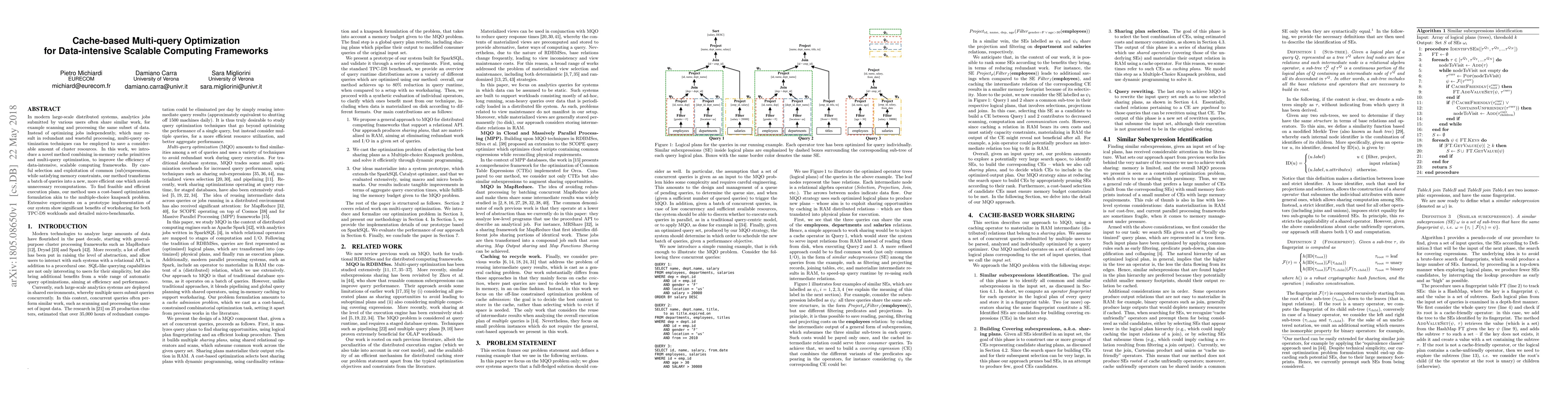 This research proposes a novel method to optimize multi-query processing in scalable computing frameworks by integrating in-memory cache primitives with multi-query optimization, aiming to reduce redundant computations and resource usage. Experimental results demonstrate significant efficiency improvements for both TPC-DS workloads and micro-benchmarks.