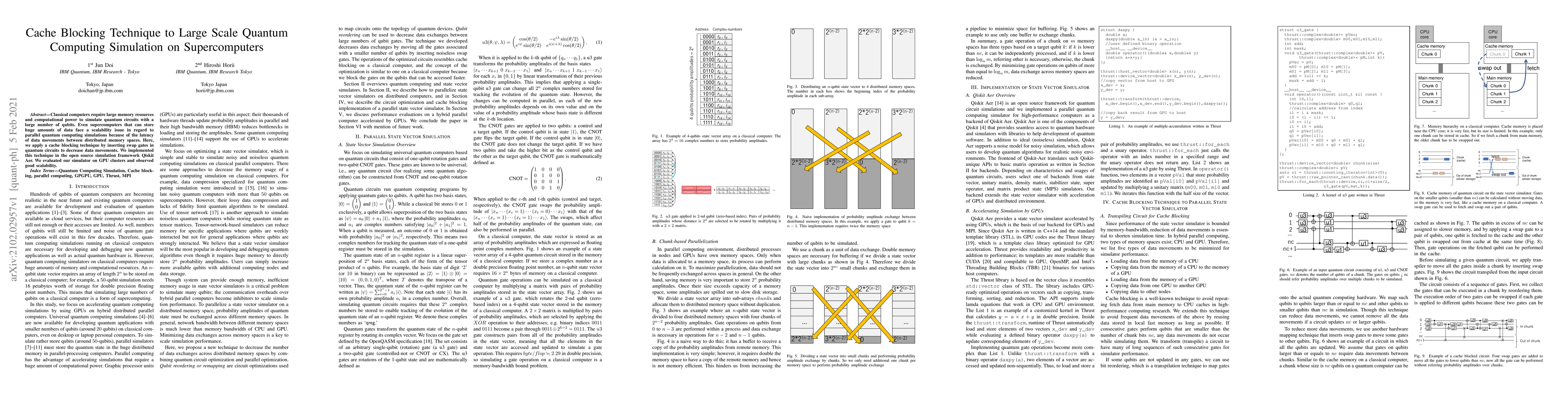 This paper explores using cache blocking techniques to enhance the scalability of large-scale quantum computing simulations on supercomputers by reducing data movement latency. The proposed method, implemented in Qiskit Aer, was tested on GPU clusters, demonstrating improved scalability.