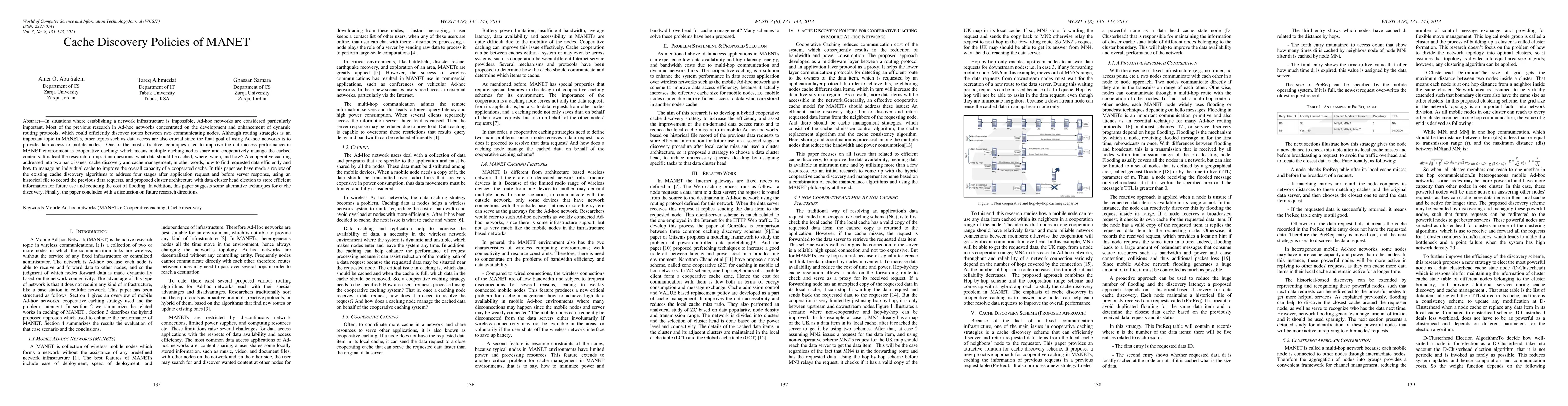 This paper reviews existing cache discovery algorithms in MANETs, focusing on cooperative caching to enhance data access. It proposes a cluster-based architecture with elected data cluster heads to efficiently manage cached data and reduce the cost of flooding, along with alternative techniques for cache discovery, and discusses future research directions.