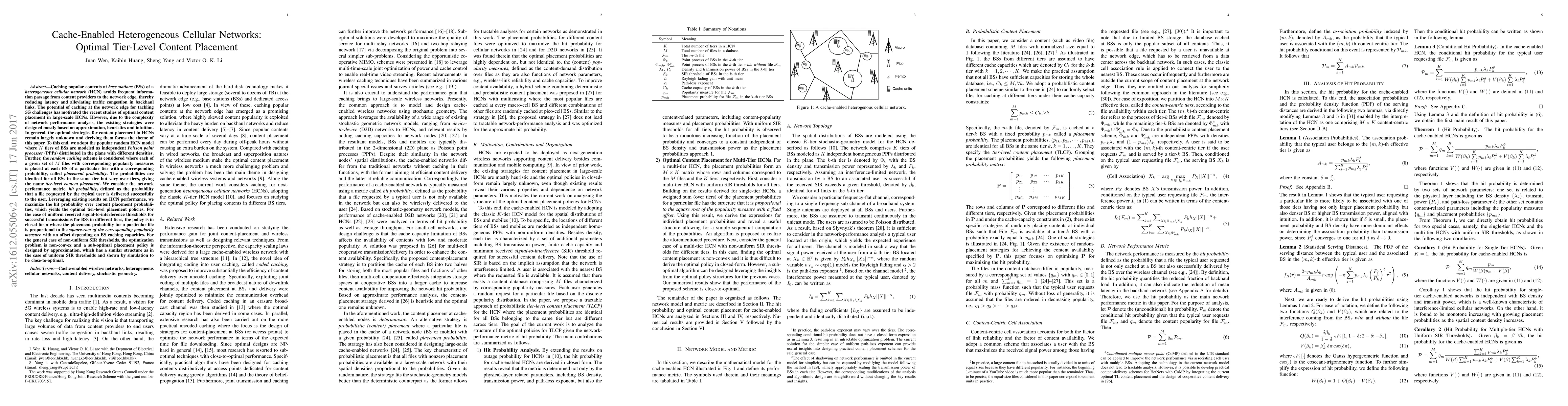 This paper investigates optimal tier-level content placement strategies in cache-enabled heterogeneous cellular networks to maximize hit probability and reduce latency. It derives closed-form optimal policies for uniform signal conditions and approximates sub-optimal solutions for non-uniform conditions.