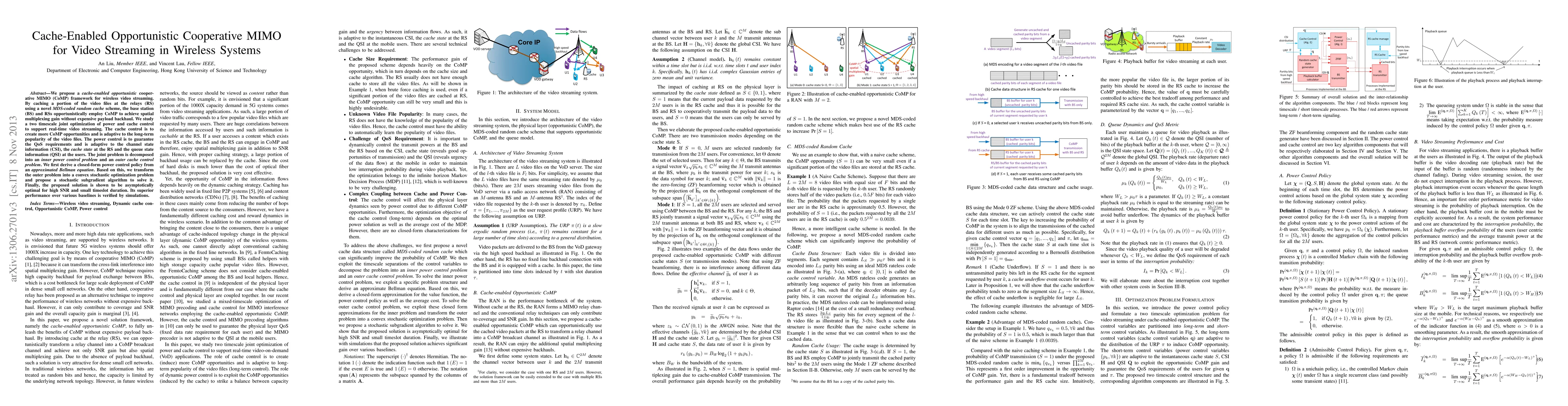 This paper proposes a cache-enabled opportunistic cooperative MIMO framework for wireless video streaming, utilizing a novel MDS-coded random cache scheme at relays to enhance spatial multiplexing gain. The study optimizes power and cache control in two timescales to meet real-time streaming requirements, with simulations demonstrating superior performance over baselines.