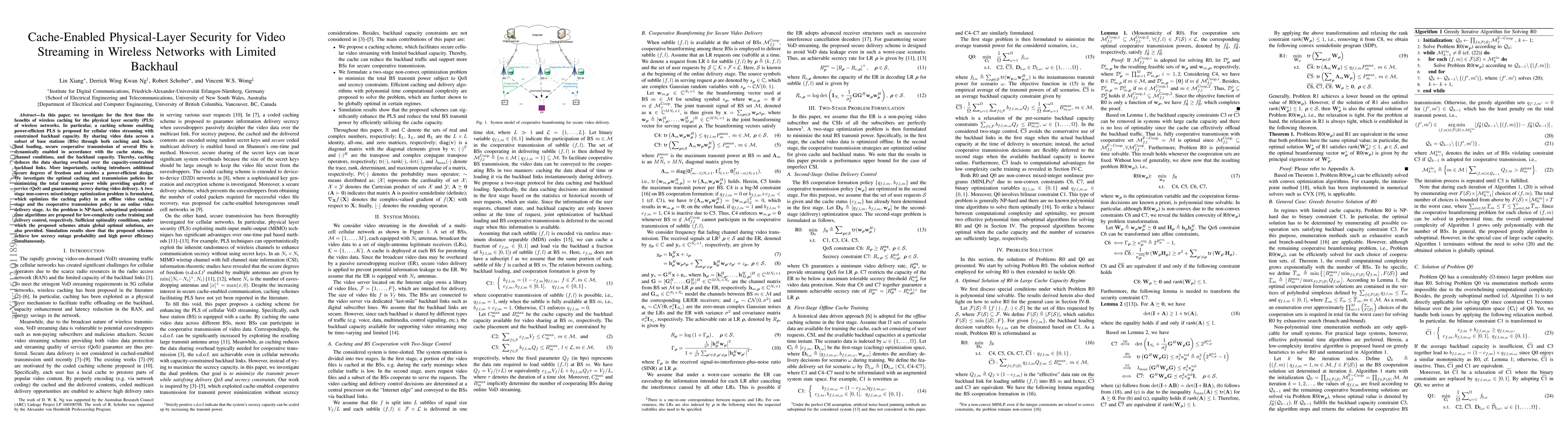 This paper proposes a caching scheme to enhance physical-layer security in wireless networks for video streaming, focusing on minimizing transmit power under limited backhaul capacity. The scheme leverages caching to reduce backhaul overhead and introduces secure cooperative transmission, achieving low secrecy outage probability and high power efficiency.