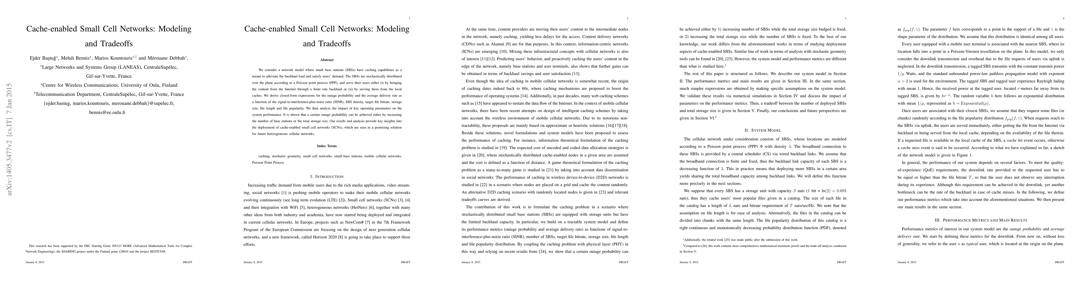 This paper models cache-enabled small cell networks to reduce backhaul load and meet user demands, deriving expressions for outage probability and average delivery rate. It analyzes the tradeoffs between network density, storage size, and performance, highlighting how increasing either base stations or storage can achieve desired outage probabilities.
