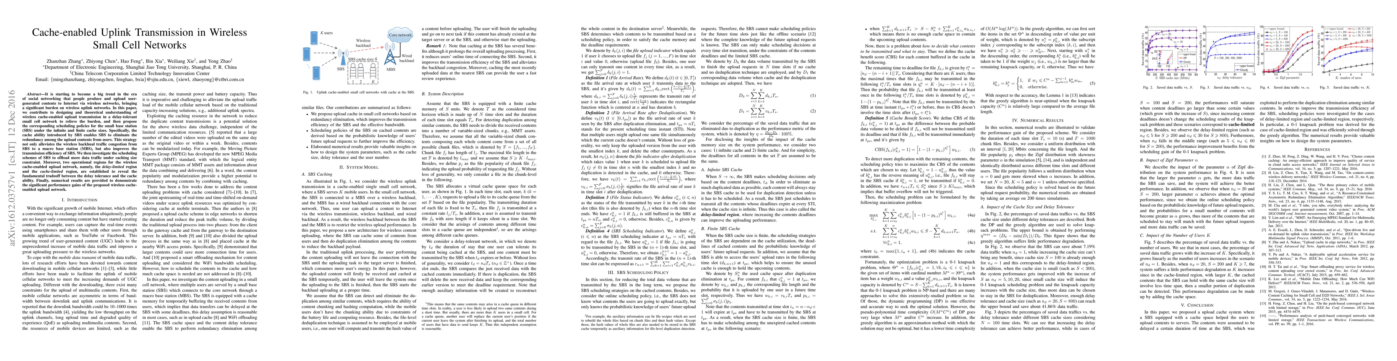 This paper explores cache-enabled uplink transmission in wireless small cell networks to alleviate congestion from user-generated content uploads. It proposes scheduling policies for small base stations (SBS) with both infinite and finite cache sizes to eliminate redundancy and improve transmission efficiency.