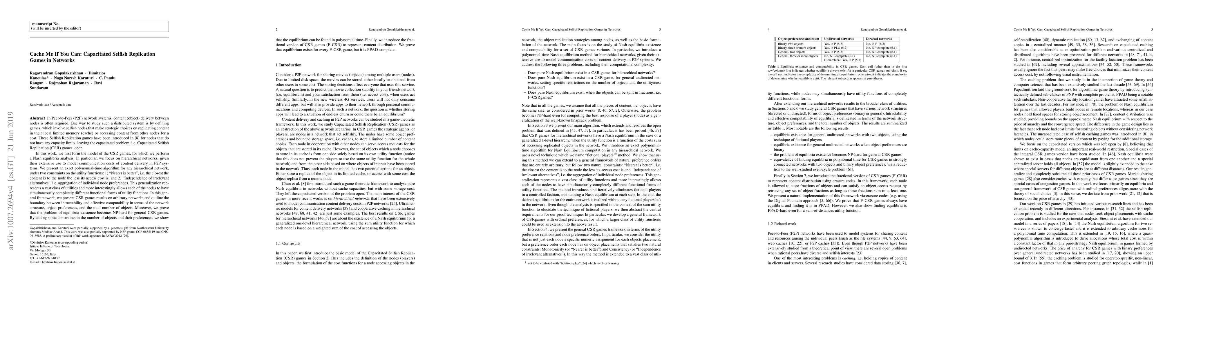 In Peer-to-Peer (P2P) network systems, content (object) delivery between nodes is often required. One way to study such a distributed system is by defining games, which involve selfish nodes that make strategic choices on replicating content in their local limited memory (cache) or accessing content from other nodes for a cost. These Selfish Replication games have been introduced in [8] for nodes that do not have any capacity limits, leaving the capacitated problem, i.e. Capacitated Selfish Replication (CSR) games, open. In this work, we first form the model of the CSR games, for which we perform a Nash equilibria analysis. In particular, we focus on hierarchical networks, given their extensive use to model communication costs of content delivery in P2P systems. We present an exact polynomial-time algorithm for any hierarchical network, under two constraints on the utility functions: 1) "Nearer is better", i.e. the closest the content is to the node the less its access cost is, and 2) "Independence of irrelevant alternatives", i.e. aggregation of individual node preferences. This generalization represents a vast class of utilities and more interestingly allows each of the nodes to have simultaneously completely different functional forms of utility functions. In this general framework, we present CSR games results on arbitrary networks and outline the boundary between intractability and effective computability in terms of the network structure, object preferences, and the total number of objects. Moreover, we prove that the problem of equilibria existence becomes NP-hard for general CSR games.
