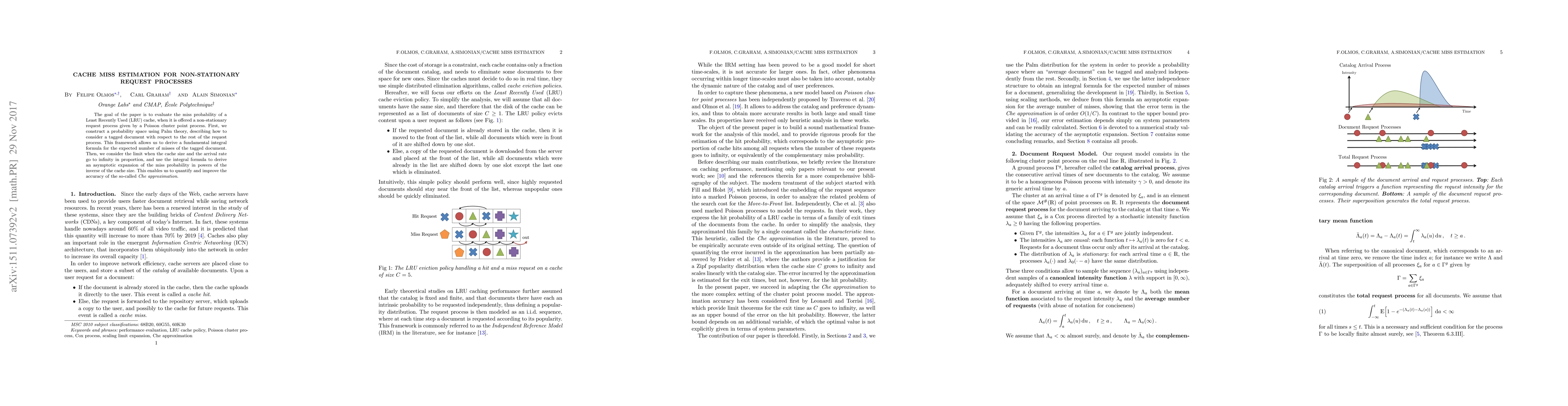The aim of the paper is to evaluate the miss probability of a Least Recently Used (LRU) cache, when it is offered a non-stationary request process given by a Poisson cluster point process. First, we construct a probability space using Palm theory, describing how to consider a tagged document with respect to the rest of the request process. This framework allows us to derive a general integral formula for the expected number of misses of the tagged document. Then, we consider the limit when the cache size and the arrival rate go to infinity proportionally, and use the integral formula to derive an asymptotic expansion of the miss probability in powers of the inverse of the cache size. This enables us to quantify and improve the accuracy of the so-called Che approximation.