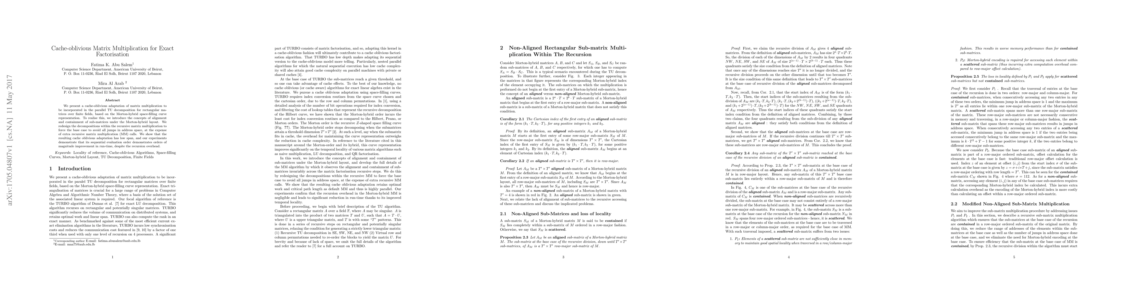 We present a cache-oblivious adaptation of matrix multiplication to be incorporated in the parallel TU decomposition for rectangular matrices over finite fields, based on the Morton-hybrid space-filling curve representation. To realise this, we introduce the concepts of alignment and containment of sub-matrices under the Morton-hybrid layout. We redesign the decompositions within the recursive matrix multiplication to force the base case to avoid all jumps in address space, at the expense of extra recursive matrix multiplication (MM) calls. We show that the resulting cache oblivious adaptation has low span, and our experiments demonstrate that its sequential evaluation order demonstrates orders of magnitude improvement in run-time, despite the recursion overhead.