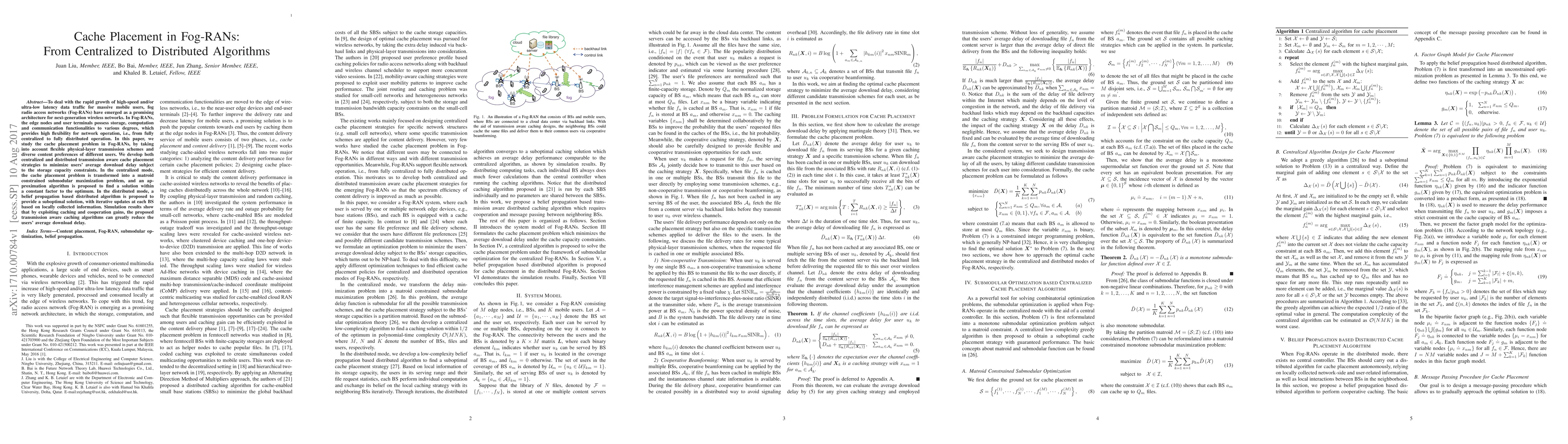 This paper develops centralized and distributed cache placement strategies for Fog-RANs to minimize user download delay. It formulates the problem as a matroid constrained submodular maximization, proposing an approximation algorithm for centralized placement and a belief propagation-based distributed algorithm for decentralized solutions.