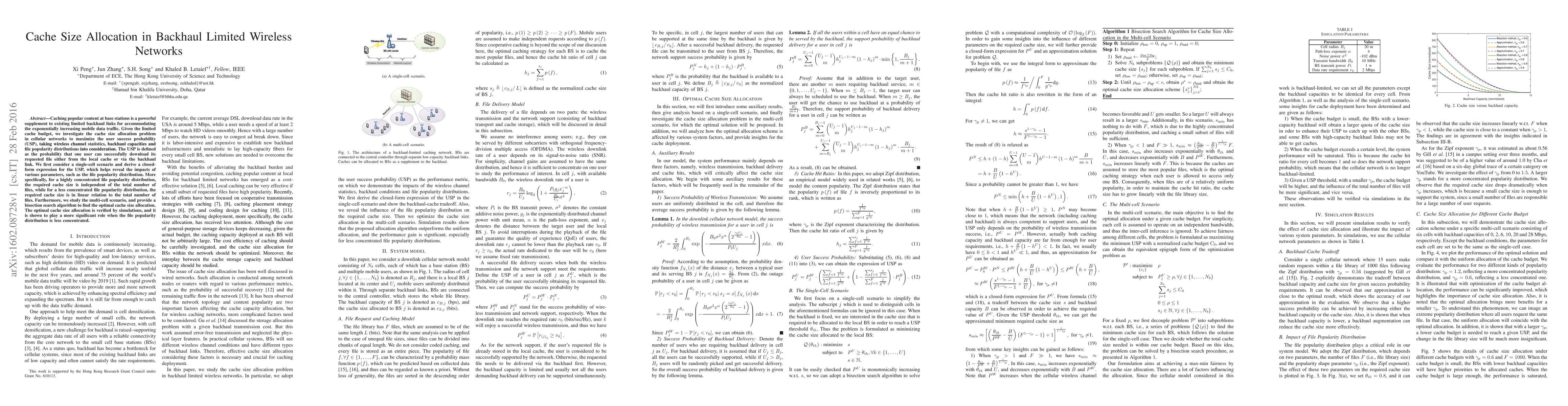 This paper investigates cache size allocation strategies in backhaul-limited wireless networks to maximize user success probability by caching popular content at base stations. It derives a closed-form expression for a single-cell scenario and proposes a bisection search algorithm for multi-cell scenarios, demonstrating that cache size requirements vary with file popularity distribution.