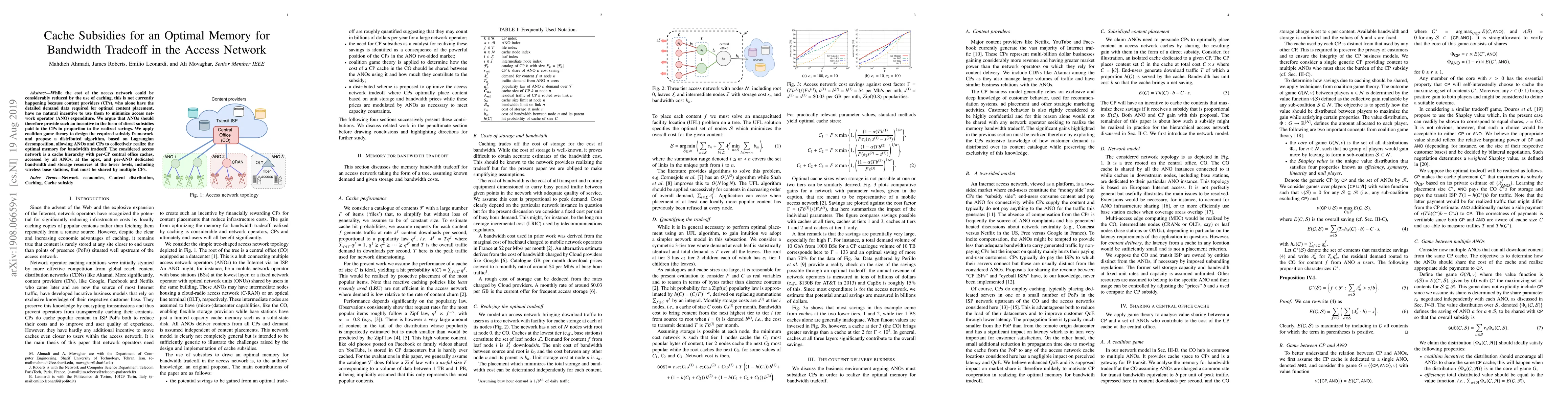 While the cost of the access network could be considerably reduced by the use of caching, this is not currently happening because content providers (CPs), who alone have the detailed demand data required for optimal content placement, have no natural incentive to use them to minimize access network operator (ANO) expenditure. We argue that ANOs should therefore provide such an incentive in the form of direct subsidies paid to the CPs in proportion to the realized savings. We apply coalition game theory to design the required subsidy framework and propose a distributed algorithm, based on Lagrangian decomposition, allowing ANOs and CPs to collectively realize the optimal memory for bandwidth tradeoff. The considered access network is a cache hierarchy with per-CP central office caches, accessed by all ANOs, at the apex, and per-ANO dedicated bandwidth and storage resources at the lower levels, including wireless base stations, that must be shared by multiple CPs.