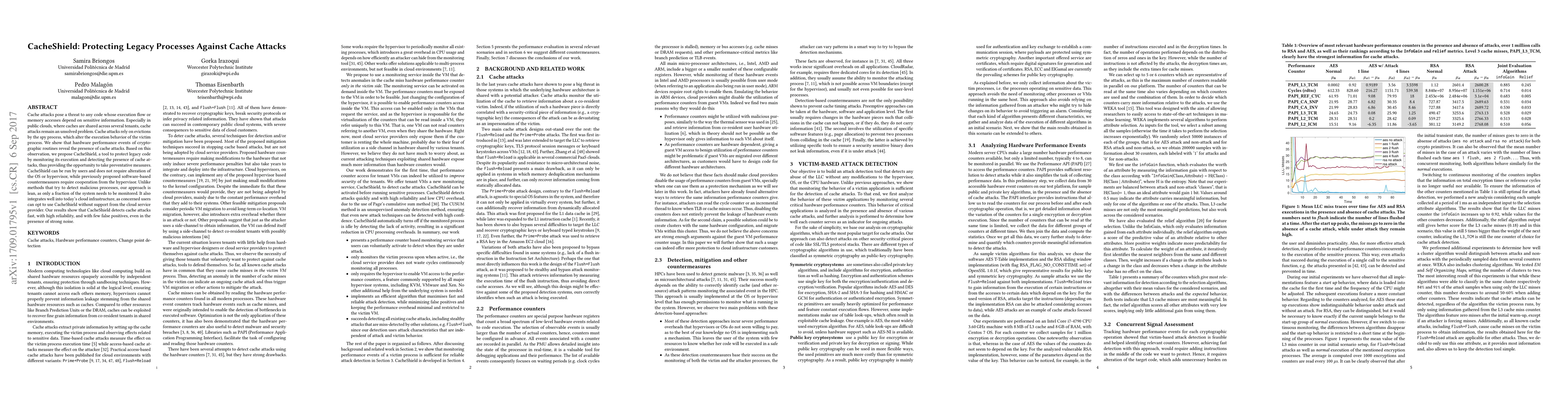 CacheShield is a tool designed to detect cache attacks in legacy processes by monitoring hardware performance events, offering a lightweight solution that doesn't require OS or hypervisor changes, unlike previous software-based countermeasures. It effectively identifies cache attacks with high reliability and minimal false positives.