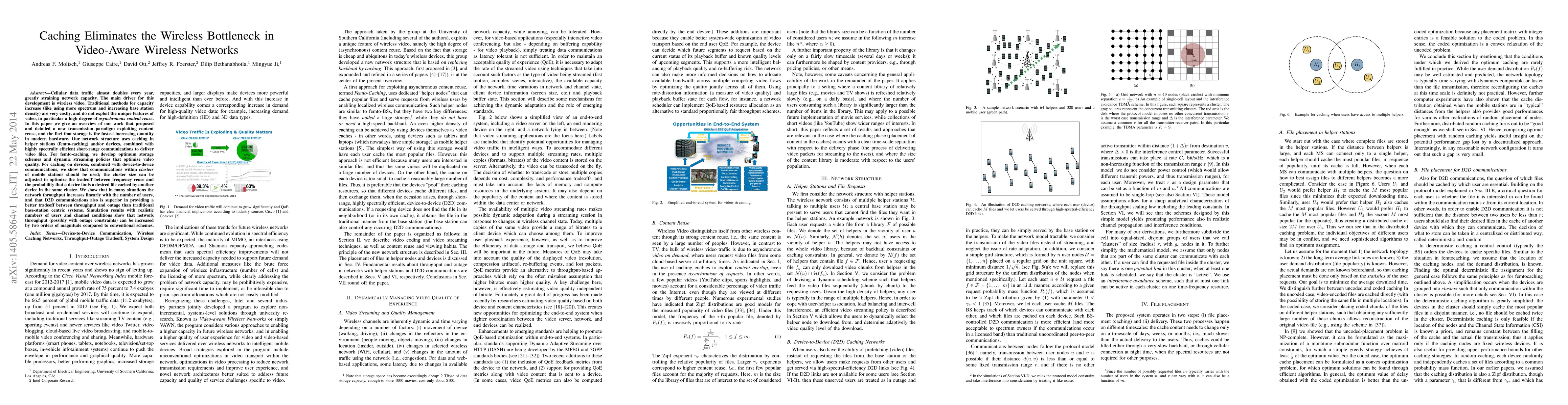 Cellular data traffic almost doubles every year, greatly straining network capacity. The main driver for this development is wireless video. Traditional methods for capacity increase (like using more spectrum and increasing base station density) are very costly, and do not exploit the unique features of video, in particular a high degree of {\em asynchronous content reuse}. In this paper we give an overview of our work that proposed and detailed a new transmission paradigm exploiting content reuse, and the fact that storage is the fastest-increasing quantity in modern hardware. Our network structure uses caching in helper stations (femto-caching) and/or devices, combined with highly spectrally efficient short-range communications to deliver video files. For femto-caching, we develop optimum storage schemes and dynamic streaming policies that optimize video quality. For caching on devices, combined with device-to-device communications, we show that communications within {\em clusters} of mobile stations should be used; the cluster size can be adjusted to optimize the tradeoff between frequency reuse and the probability that a device finds a desired file cached by another device in the same cluster. We show that in many situations the network throughput increases linearly with the number of users, and that D2D communications also is superior in providing a better tradeoff between throughput and outage than traditional base-station centric systems. Simulation results with realistic numbers of users and channel conditions show that network throughput (possibly with outage constraints) can be increased by two orders of magnitude compared to conventional schemes.