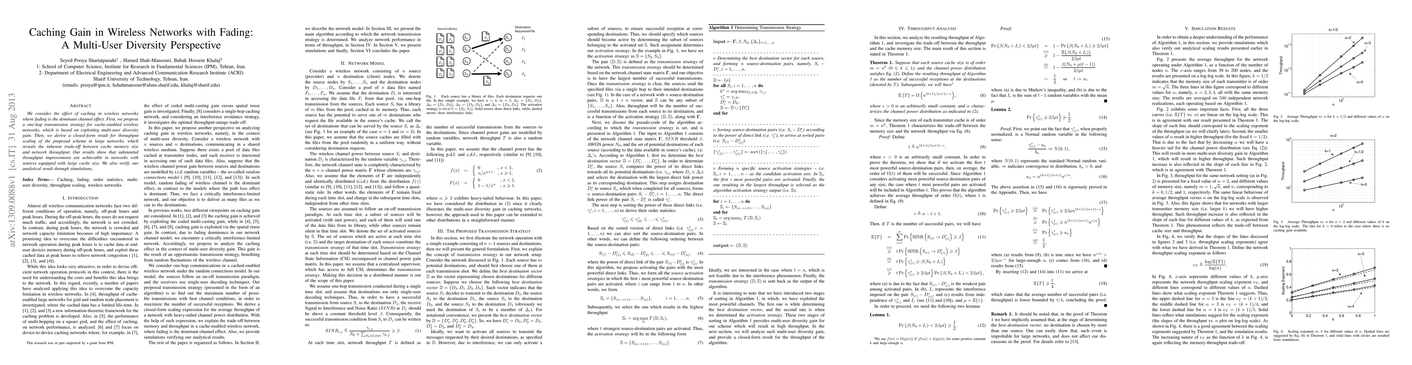 This paper proposes a caching strategy for wireless networks with fading channels, leveraging multi-user diversity to enhance throughput. It derives a closed-form expression for throughput scaling, demonstrating significant gains with larger cache sizes, and validates the findings through simulations.
