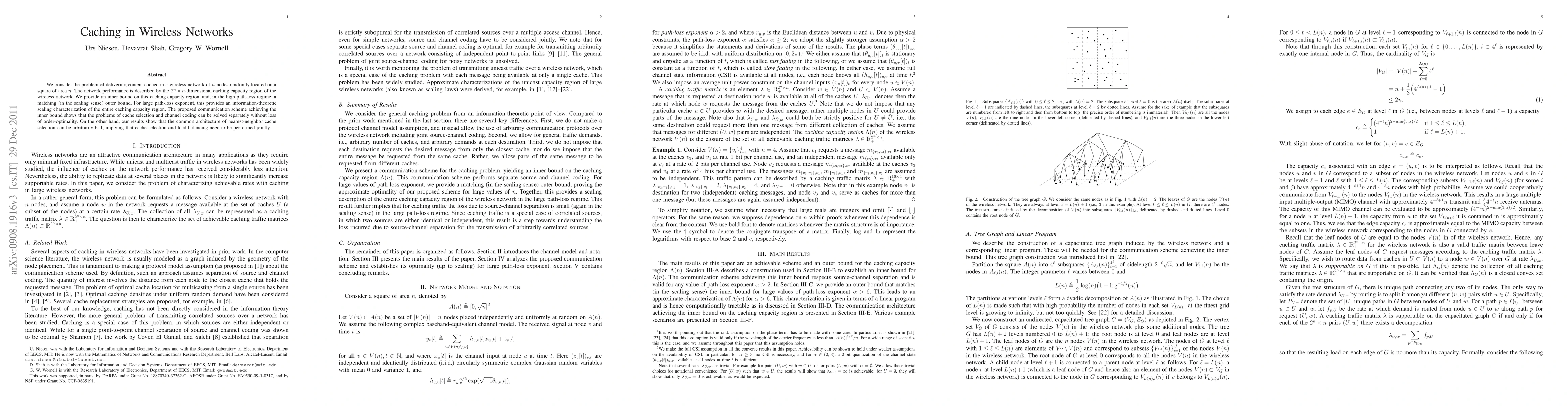 We consider the problem of delivering content cached in a wireless network of n nodes randomly located on a square of area n. The network performance is described by the n2^n-dimensional caching capacity region of the wireless network. We provide an inner bound on this caching capacity region, and, in the high path-loss regime, a matching (in the scaling sense) outer bound. For large path-loss exponent, this provides an information-theoretic scaling characterization of the entire caching capacity region. The proposed communication scheme achieving the inner bound shows that the problems of cache selection and channel coding can be solved separately without loss of order-optimality. On the other hand, our results show that the common architecture of nearest-neighbor cache selection can be arbitrarily bad, implying that cache selection and load balancing need to be performed jointly.