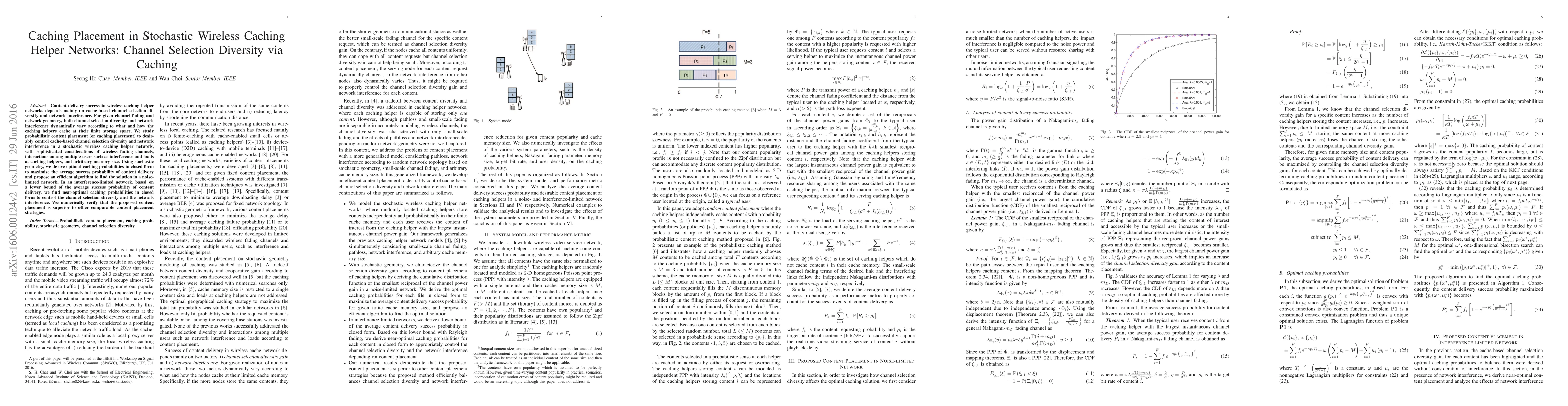 This paper investigates optimal probabilistic content placement strategies in stochastic wireless caching helper networks to enhance content delivery success by managing cache-based channel selection diversity and network interference. The authors derive optimal and near-optimal caching probabilities in closed form and propose efficient algorithms, demonstrating superior performance compared to other strategies.