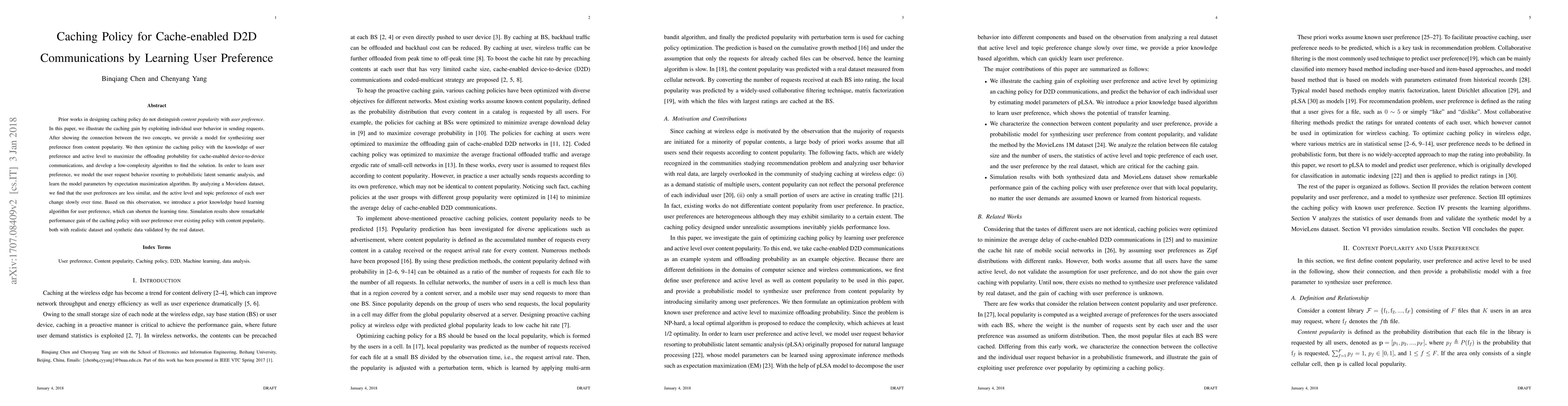 This paper develops a caching policy for cache-enabled D2D communications that considers user preference, outperforming existing policies with content popularity. It uses probabilistic latent semantic analysis to learn user preferences and achieves significant performance gains.