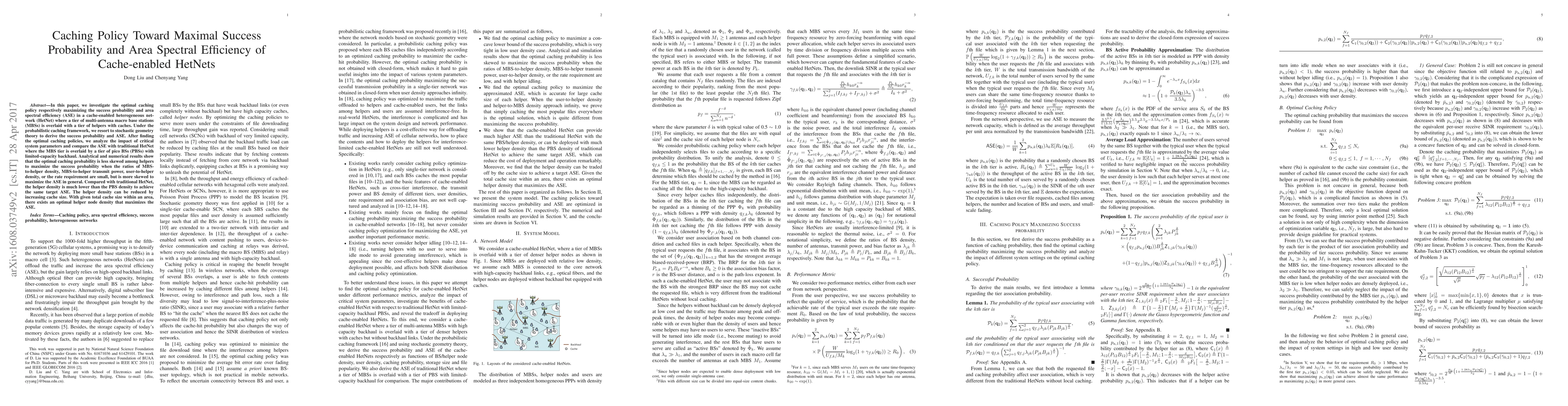 This paper investigates optimal caching policies to maximize success probability and area spectral efficiency in cache-enabled HetNets, finding that helper density can be reduced by increasing cache size while maintaining the same target ASE.