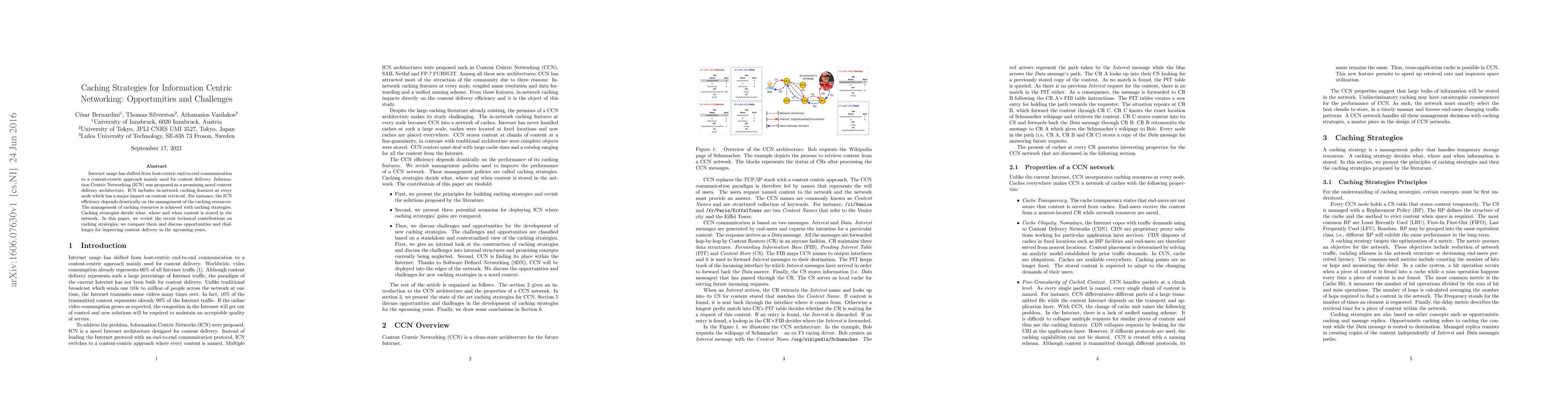Internet usage has shifted from host-centric end-to-end communication to a content-centric approach mainly used for content delivery. Information Centric Networking (ICN) was proposed as a promising novel content delivery architecture. ICN includes in-network caching features at every node which has a major impact on content retrieval. For instance, the ICN efficiency depends drastically on the management of the caching resources. The management of caching resources is achieved with caching strategies. Caching strategies decide what, where and when content is stored in the network. In this paper, we revisit the recent technical contributions on caching strategies, we compare them and discuss opportunities and challenges for improving content delivery in the upcoming years.