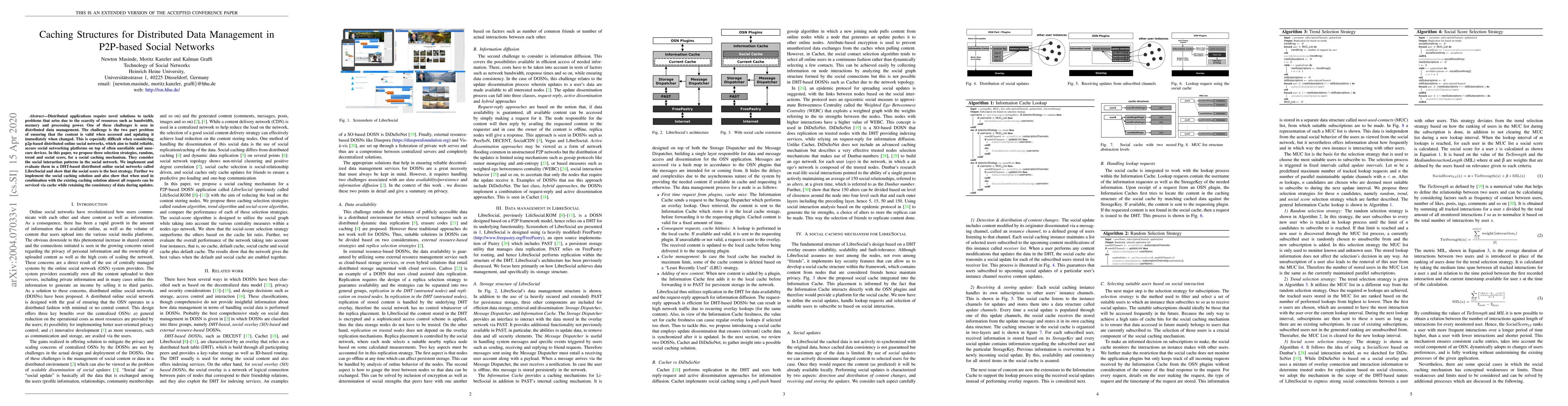 This paper proposes three caching strategies—random, trend, and social score—for managing distributed data in P2P-based social networks, focusing on improving reliability and consistency. The social score strategy, which considers social interaction patterns, proved most effective in experiments with LibreSocial, enabling efficient request servicing via cache while maintaining data consistency during updates.