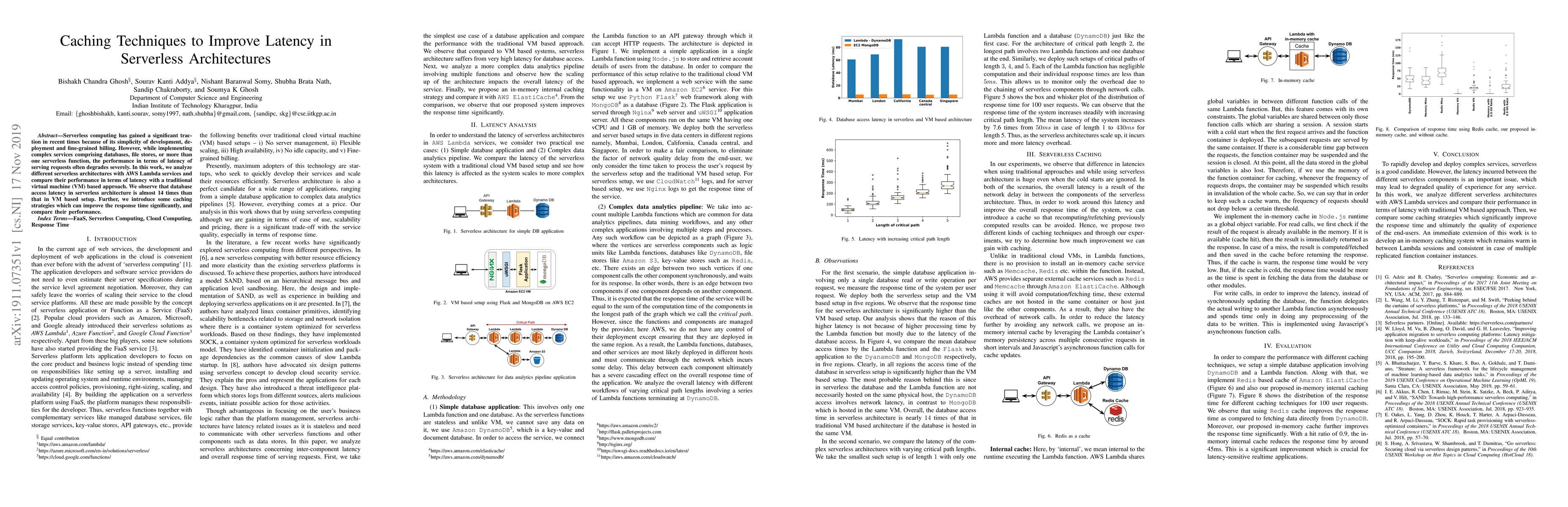 This paper investigates latency issues in serverless architectures using AWS Lambda, finding that database access is 14 times slower than in VM-based setups. It proposes caching strategies to improve response times and compares their performance.