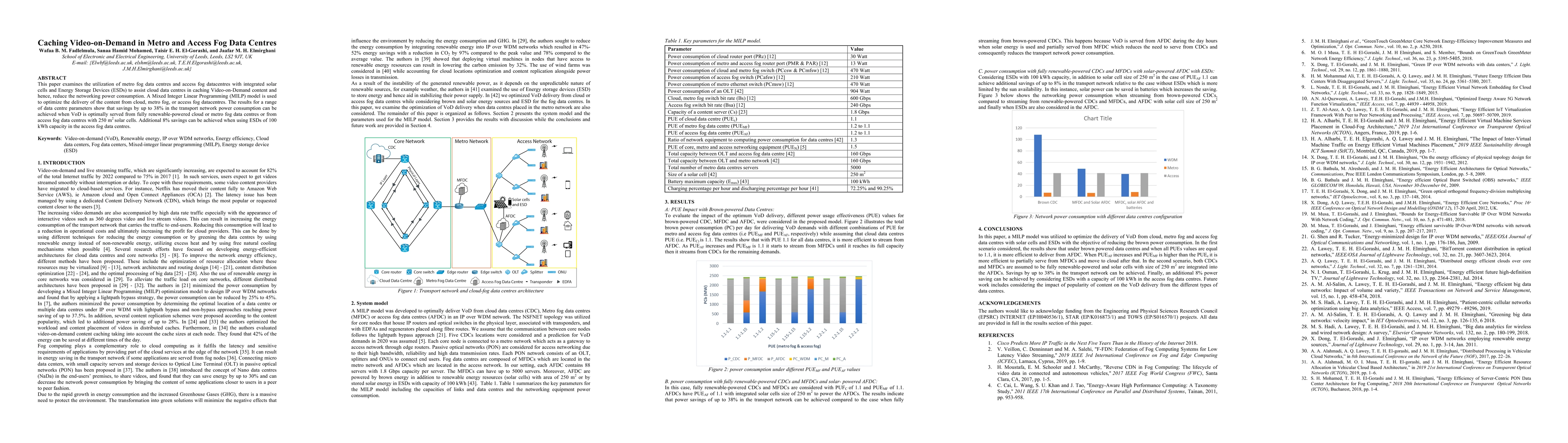 This paper examines the utilization of metro fog data centres and access fog datacentres with integrated solar cells and Energy Storage Devices (ESDs) to assist cloud data centres in caching Video-on-Demand content and hence, reduce the networking power consumption. A Mixed Integer Linear Programming (MILP) model is used to optimize the delivery of the content from cloud, metro fog, or access fog datacentres. The results for a range of data centre parameters show that savings by up to 38% in the transport network power consumption can be achieved when VoD is optimally served from fully renewable-powered cloud or metro fog data centres or from access fog data centres with 250 m2 solar cells. Additional 8% savings can be achieved when using ESDs of 100 kWh capacity in the access fog data centres.
