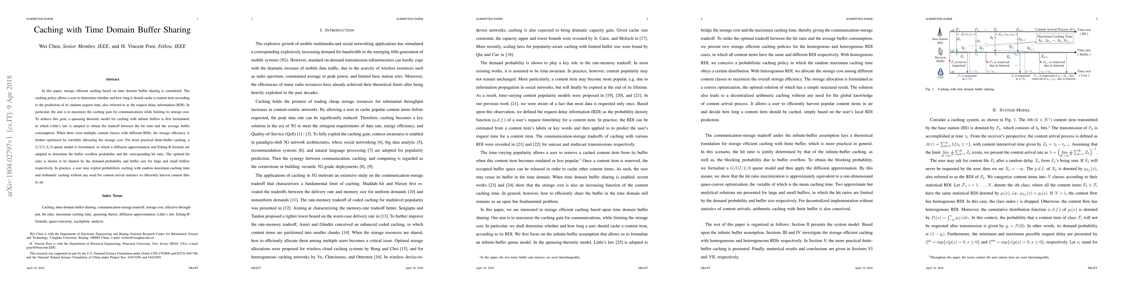 This paper proposes a storage-efficient caching strategy based on time domain buffer sharing, optimizing the hit ratio while controlling storage costs. It uses a queueing model to analyze infinite buffers and finite buffers, showing how probabilistic caching can maximize caching gains without requiring detailed content arrival statistics.