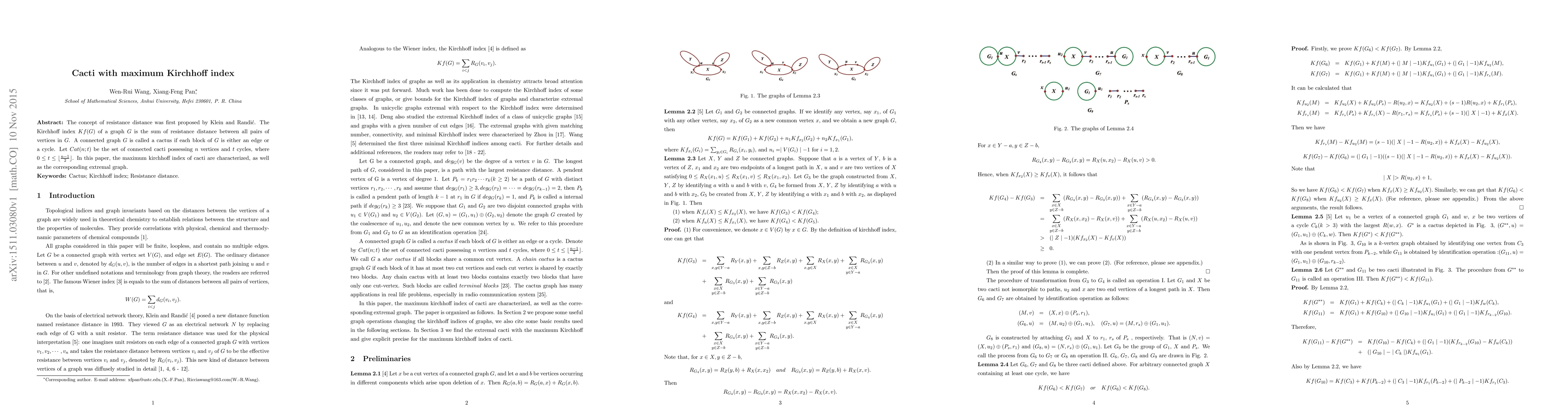 This paper characterizes the cactus graphs with the maximum Kirchhoff index, which measures the sum of resistance distances between all pairs of vertices, and identifies the extremal graph in the set of connected cacti with a specified number of vertices and cycles.