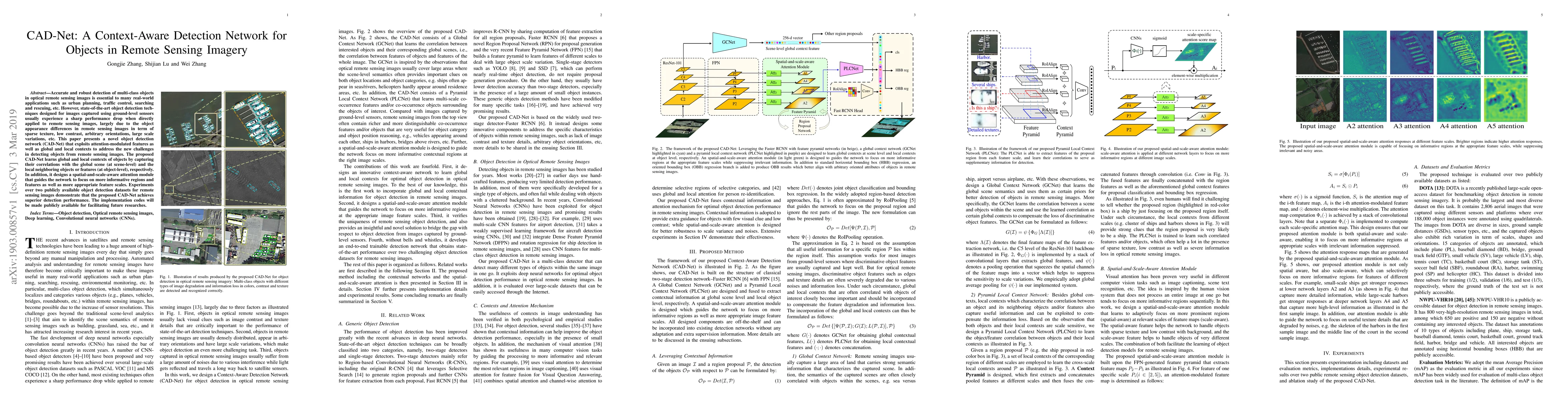 CAD-Net is a novel context-aware detection network designed to accurately detect multi-class objects in remote sensing imagery, addressing challenges like sparse texture and large scale variations. It leverages attention-modulated features and global/local context to achieve superior detection performance.