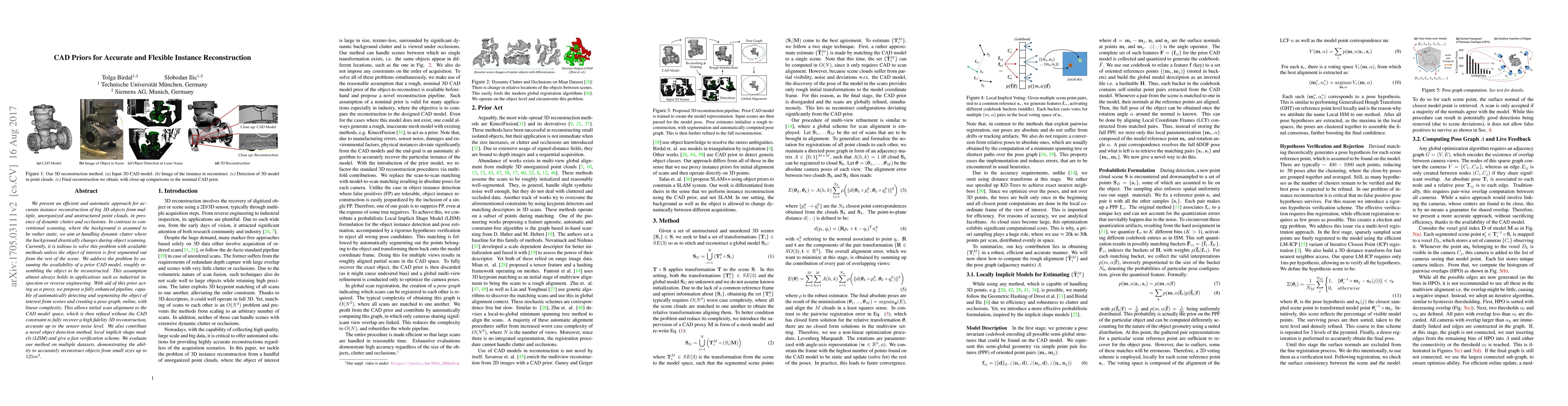 We present an efficient and automatic approach for accurate reconstruction of instances of big 3D objects from multiple, unorganized and unstructured point clouds, in presence of dynamic clutter and occlusions. In contrast to conventional scanning, where the background is assumed to be rather static, we aim at handling dynamic clutter where background drastically changes during the object scanning. Currently, it is tedious to solve this with available methods unless the object of interest is first segmented out from the rest of the scene. We address the problem by assuming the availability of a prior CAD model, roughly resembling the object to be reconstructed. This assumption almost always holds in applications such as industrial inspection or reverse engineering. With aid of this prior acting as a proxy, we propose a fully enhanced pipeline, capable of automatically detecting and segmenting the object of interest from scenes and creating a pose graph, online, with linear complexity. This allows initial scan alignment to the CAD model space, which is then refined without the CAD constraint to fully recover a high fidelity 3D reconstruction, accurate up to the sensor noise level. We also contribute a novel object detection method, local implicit shape models (LISM) and give a fast verification scheme. We evaluate our method on multiple datasets, demonstrating the ability to accurately reconstruct objects from small sizes up to $125m^3$.