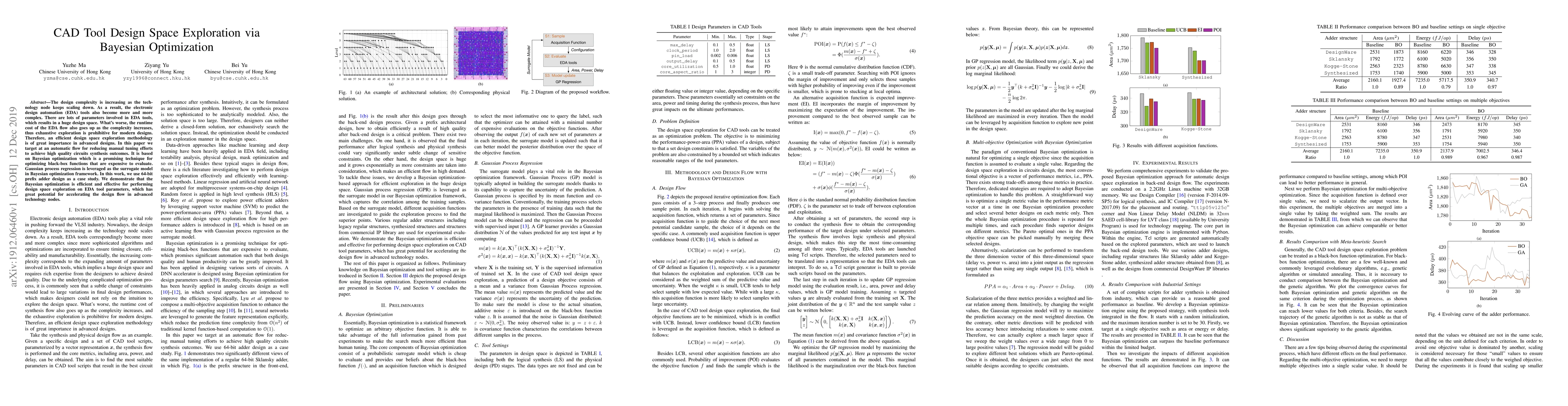 This paper proposes a Bayesian optimization approach to efficiently explore the design space of complex electronic design automation (EDA) tools, using Gaussian process regression as a surrogate model. The method is demonstrated on 64-bit prefix adder design, showing its effectiveness in reducing manual tuning and accelerating the design flow in advanced technology nodes.