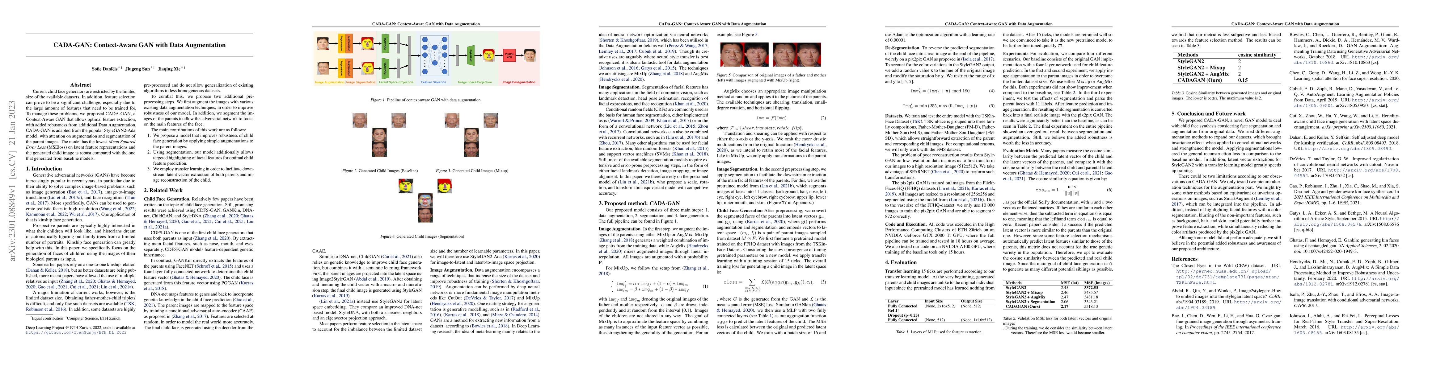 CADA-GAN is a Context-Aware GAN enhanced with data augmentation to tackle the limitations of small datasets and complex feature selection in child face generation. It achieves optimal feature extraction and robustness, demonstrating lower Mean Squared Error Loss compared to baseline models.