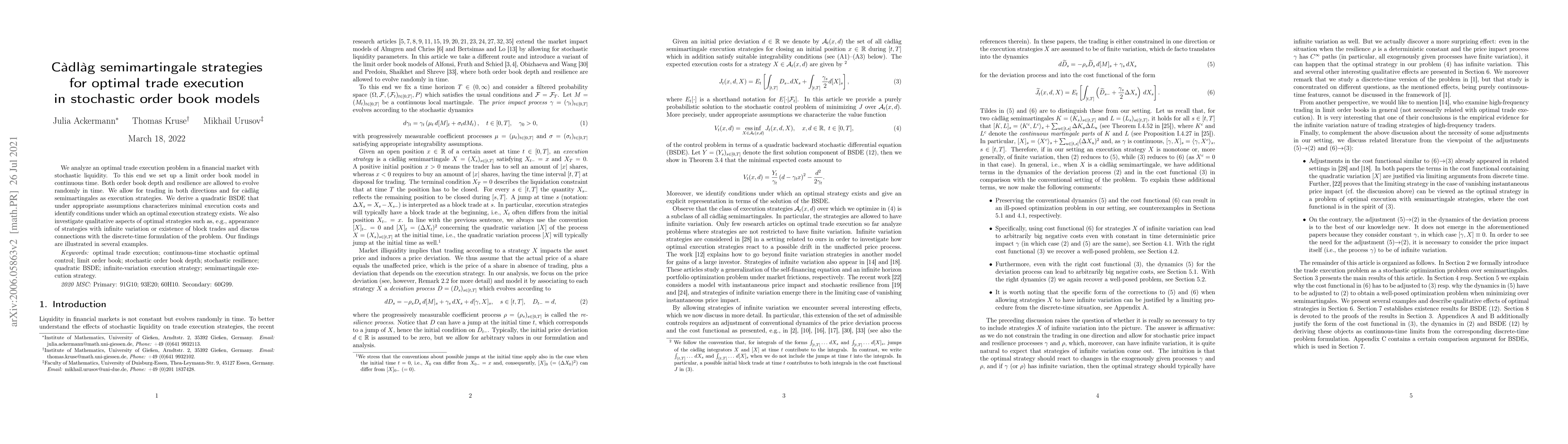 This paper develops a continuous-time stochastic model for optimal trade execution in a limit order book with evolving liquidity, employing càdlàg semimartingale strategies. It derives a quadratic BSDE to characterize minimal execution costs and discusses conditions for the existence of optimal strategies, including scenarios with infinite variation or block trades.