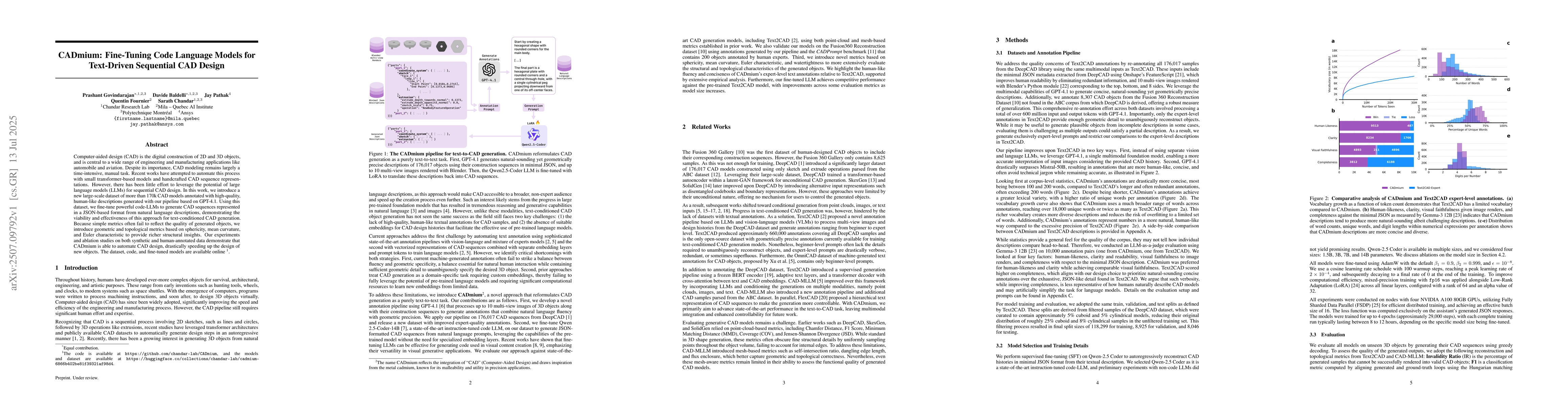 Computer-aided design (CAD) is the digital construction of 2D and 3D objects, and is central to a wide range of engineering and manufacturing applications like automobile and aviation. Despite its importance, CAD modeling remains largely a time-intensive, manual task. Recent works have attempted to automate this process with small transformer-based models and handcrafted CAD sequence representations. However, there has been little effort to leverage the potential of large language models (LLMs) for sequential CAD design. In this work, we introduce a new large-scale dataset of more than 170k CAD models annotated with high-quality, human-like descriptions generated with our pipeline based on GPT-4.1. Using this dataset, we fine-tune powerful code-LLMs to generate CAD sequences represented in a JSON-based format from natural language descriptions, demonstrating the viability and effectiveness of this approach for text-conditioned CAD generation. Because simple metrics often fail to reflect the quality of generated objects, we introduce geometric and topological metrics based on sphericity, mean curvature, and Euler characteristic to provide richer structural insights. Our experiments and ablation studies on both synthetic and human-annotated data demonstrate that CADmium is able to automate CAD design, drastically speeding up the design of new objects. The dataset, code, and fine-tuned models are available online.