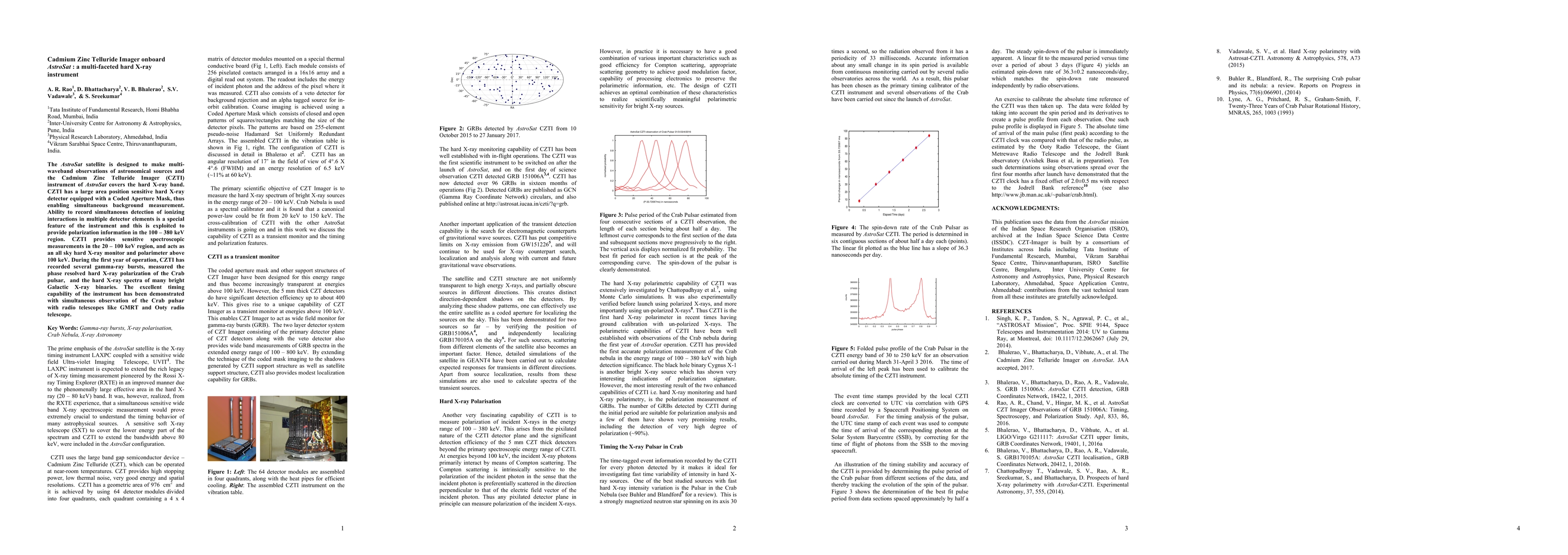 The AstroSat satellite's Cadmium Zinc Telluride Imager (CZTI) is a multi-faceted hard X-ray instrument that provides sensitive spectroscopic measurements and polarization information in the 20-380 keV range, functioning as an all-sky hard X-ray monitor and polarimeter. CZTI has recorded several gamma-ray bursts and demonstrated excellent timing capability through simultaneous observations with radio telescopes.