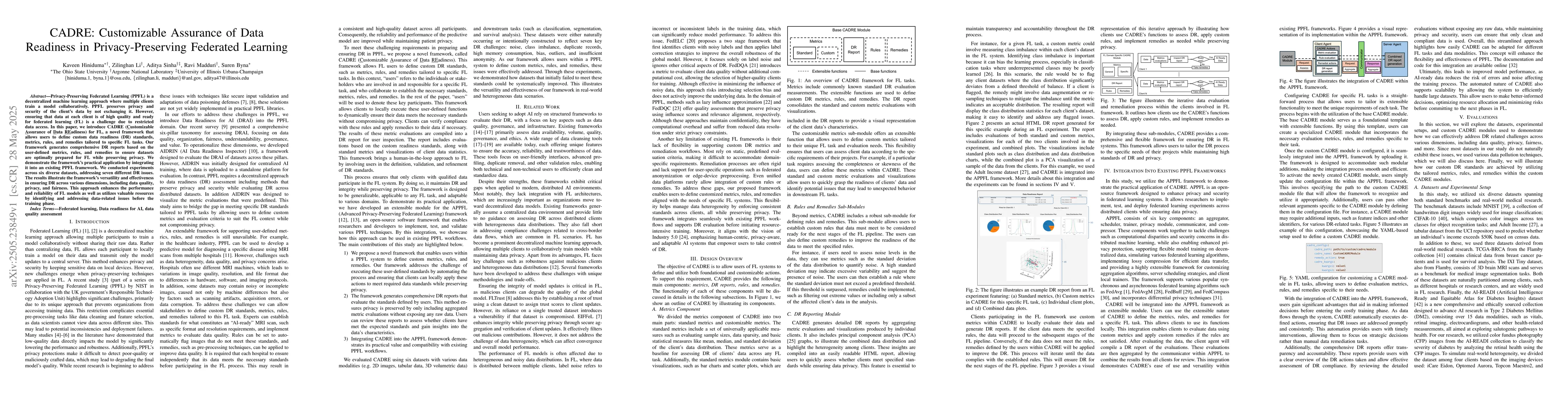 Privacy-Preserving Federated Learning (PPFL) is a decentralized machine learning approach where multiple clients train a model collaboratively. PPFL preserves privacy and security of the client's data by not exchanging it. However, ensuring that data at each client is of high quality and ready for federated learning (FL) is a challenge due to restricted data access. In this paper, we introduce CADRE (Customizable Assurance of Data REadiness) for FL, a novel framework that allows users to define custom data readiness (DR) standards, metrics, rules, and remedies tailored to specific FL tasks. Our framework generates comprehensive DR reports based on the user-defined metrics, rules, and remedies to ensure datasets are optimally prepared for FL while preserving privacy. We demonstrate the framework's practical application by integrating it into an existing PPFL framework. We conducted experiments across six diverse datasets, addressing seven different DR issues. The results illustrate the framework's versatility and effectiveness in ensuring DR across various dimensions, including data quality, privacy, and fairness. This approach enhances the performance and reliability of FL models as well as utilizes valuable resources by identifying and addressing data-related issues before the training phase.