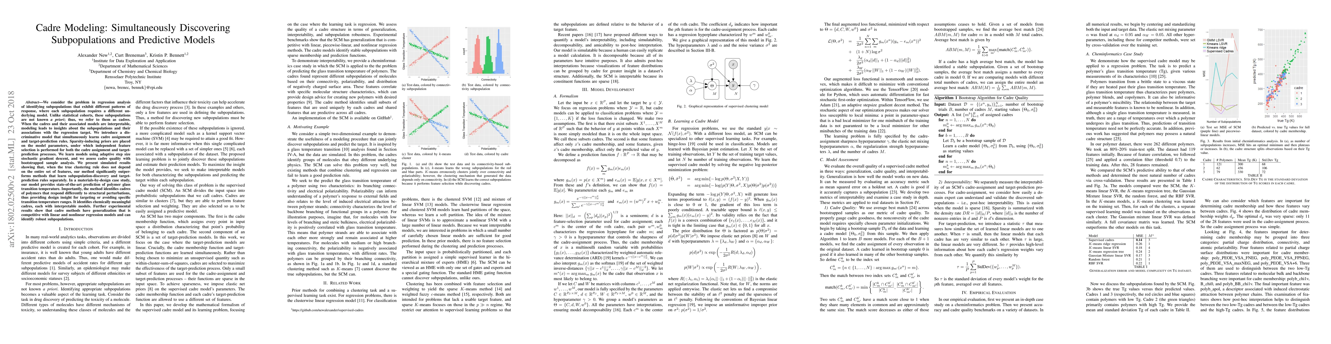 We consider the problem in regression analysis of identifying subpopulations that exhibit different patterns of response, where each subpopulation requires a different underlying model. Unlike statistical cohorts, these subpopulations are not known a priori; thus, we refer to them as cadres. When the cadres and their associated models are interpretable, modeling leads to insights about the subpopulations and their associations with the regression target. We introduce a discriminative model that simultaneously learns cadre assignment and target-prediction rules. Sparsity-inducing priors are placed on the model parameters, under which independent feature selection is performed for both the cadre assignment and target-prediction processes. We learn models using adaptive step size stochastic gradient descent, and we assess cadre quality with bootstrapped sample analysis. We present simulated results showing that, when the true clustering rule does not depend on the entire set of features, our method significantly outperforms methods that learn subpopulation-discovery and target-prediction rules separately. In a materials-by-design case study, our model provides state-of-the-art prediction of polymer glass transition temperature. Importantly, the method identifies cadres of polymers that respond differently to structural perturbations, thus providing design insight for targeting or avoiding specific transition temperature ranges. It identifies chemically meaningful cadres, each with interpretable models. Further experimental results show that cadre methods have generalization that is competitive with linear and nonlinear regression models and can identify robust subpopulations.