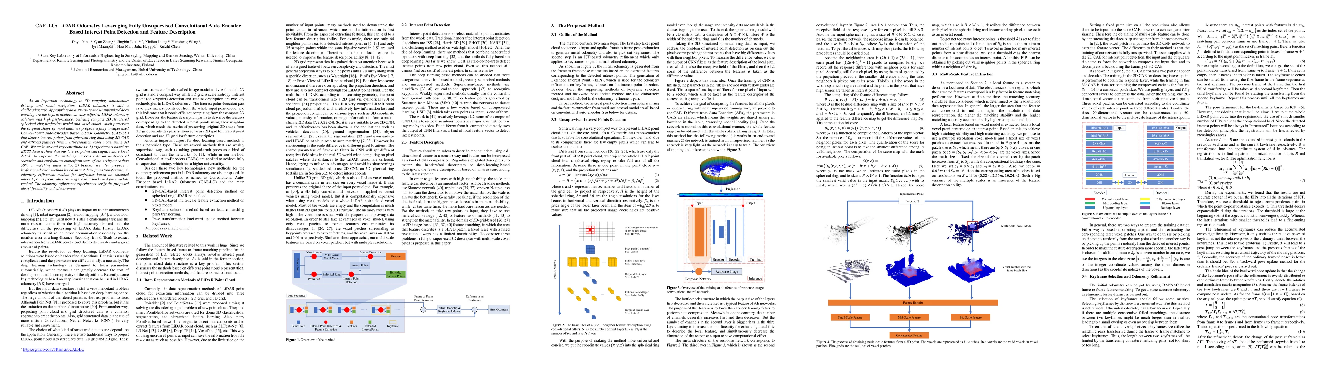 The paper presents CAE-LO, an unsupervised Convolutional Auto-Encoder for LiDAR odometry, leveraging spherical ring and voxel models to detect interest points and extract features. The method shows improved performance in matching success rates and inlier ratios on the KITTI dataset, alongside proposed keyframe selection and odometry refinement techniques.