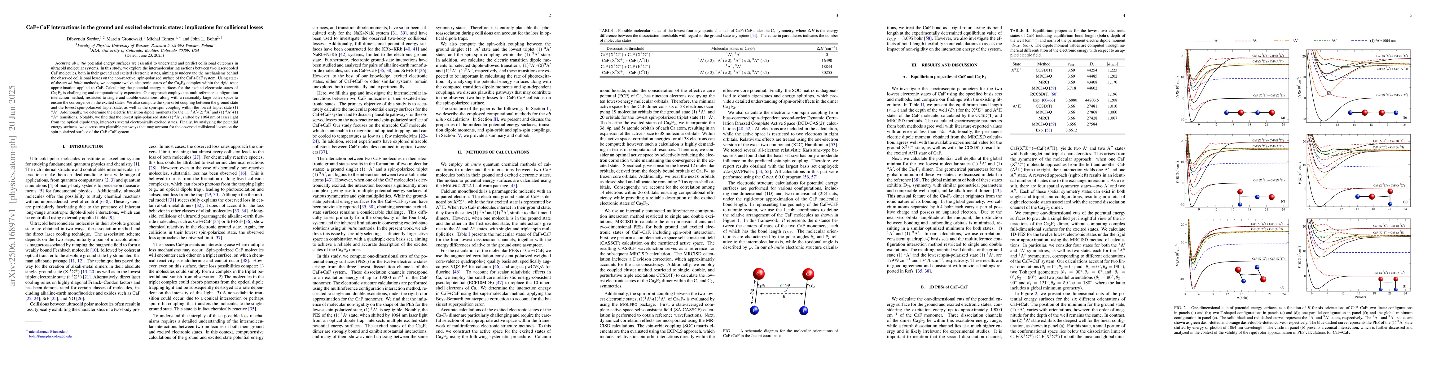 Accurate \textit{ab initio} potential energy surfaces are essential to understand and predict collisional outcomes in ultracold molecular systems. In this study, we explore the intermolecular interactions between two laser-cooled CaF molecules, both in their ground and excited electronic states, aiming to understand the mechanisms behind the observed collisional losses on the non-reactive, spin-polarized surface of the CaF+CaF system. Using state-of-the-art \textit{ab initio} methods, we compute twelve electronic states of the Ca$_2$F$_2$ complex within the rigid rotor approximation applied to CaF. Calculating the potential energy surfaces for the excited electronic states of Ca$_2$F$_2$ is challenging and computationally expensive. Our approach employs the multireference configuration interaction method, restricted to single and double excitations, along with a reasonably large active space to ensure the convergence in the excited states. We also compute the spin-orbit coupling between the ground state and the lowest spin-polarized triplet state, as well as the spin-spin coupling within the lowest triplet state (1) $^3\mathrm{A}'$. Additionally, we determine the electric transition dipole moments for the (1) $^3\mathrm{A}'$-(2) $^3\mathrm{A}'$ and (1) $^3\mathrm{A}'$-(1) $^3\mathrm{A}''$ transitions. Notably, we find that the lowest spin-polarized state (1) $^3\mathrm{A}'$, shifted by 1064 nm of laser light from the optical dipole trap, intersects several electronically excited states. Finally, by analyzing the potential energy surfaces, we discuss two plausible pathways that may account for the observed collisional losses on the spin-polarized surface of the CaF+CaF system.