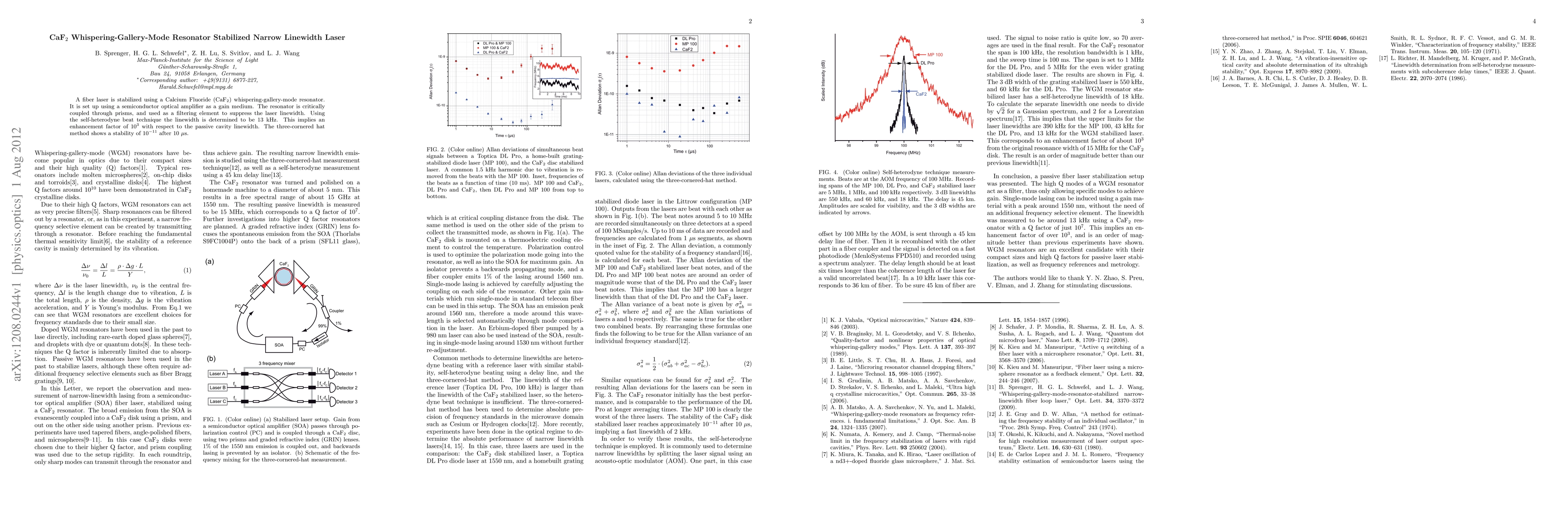This paper presents a fiber laser stabilized by a CaF2 whispering-gallery-mode resonator, achieving a linewidth of 13 kHz, which is 10^3 times narrower than a passive cavity. The resonator's stability is confirmed at 10^(-11) using the three-cornered hat method.