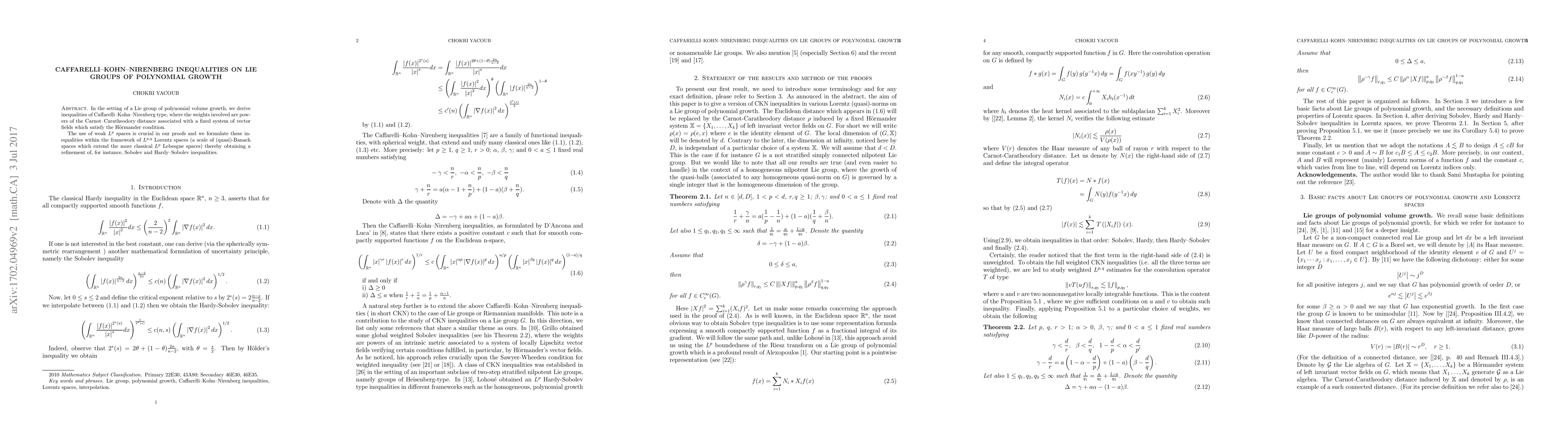 This paper derives Caffarelli-Kohn-Nirenberg inequalities for Lie groups of polynomial volume growth, employing weights based on the Carnot-Caratheodory distance. The proofs utilize weak $L^p$ spaces and are formulated within $L^{p,q}$ Lorentz spaces, refining classical Sobolev and Hardy-Sobolev inequalities.